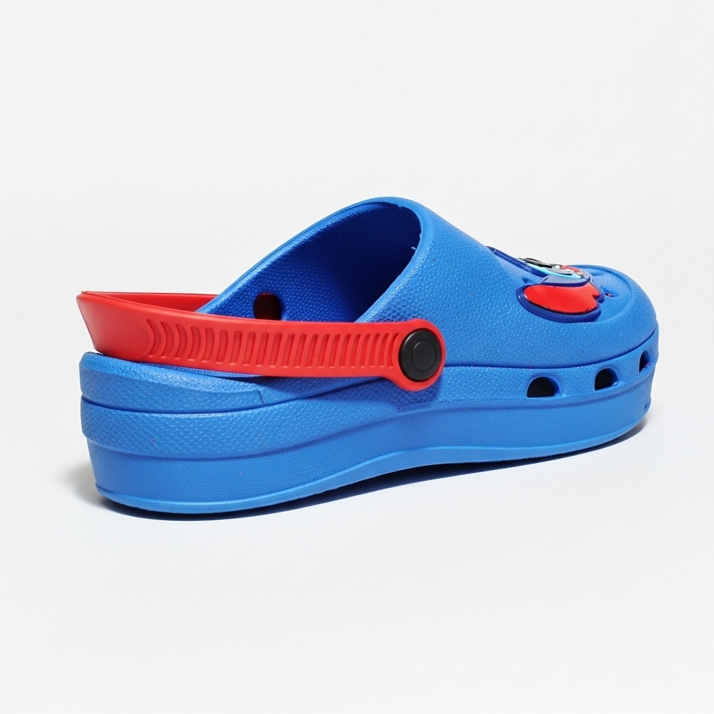 • Fechamento (Tira): Conta com uma tira de calcanhar móvel (pivotante) na cor vermelha, fixada por botões laterais pretos. A tira possui uma textura de linhas horizontais e pode ser usada para trás (modo sandália) para maior segurança, ou girada para frente (modo babuche) para um calce rápido e fácil.