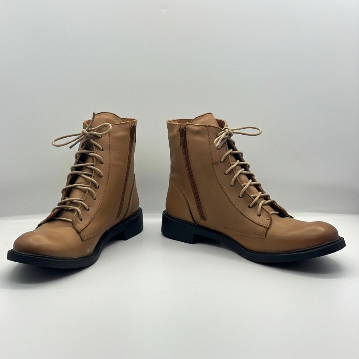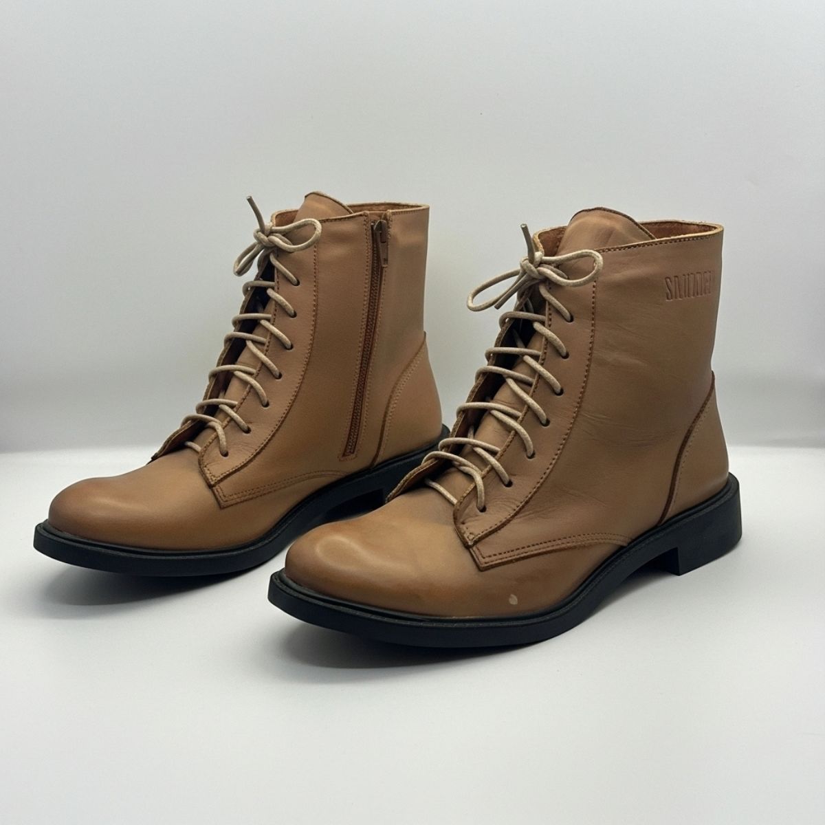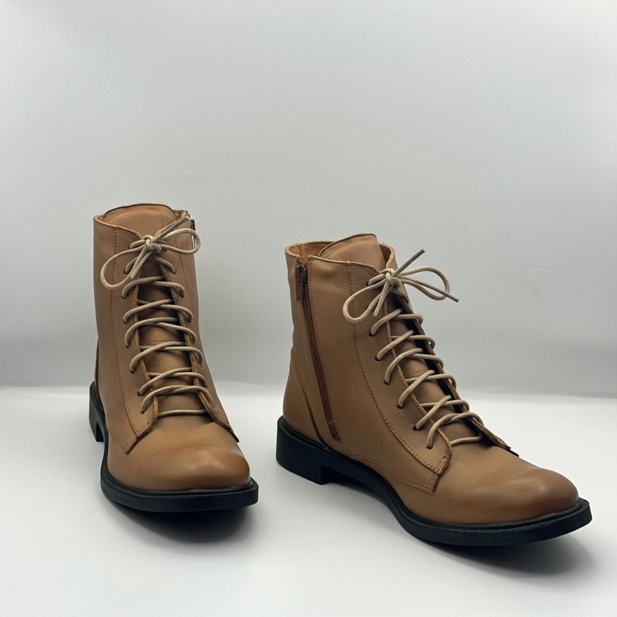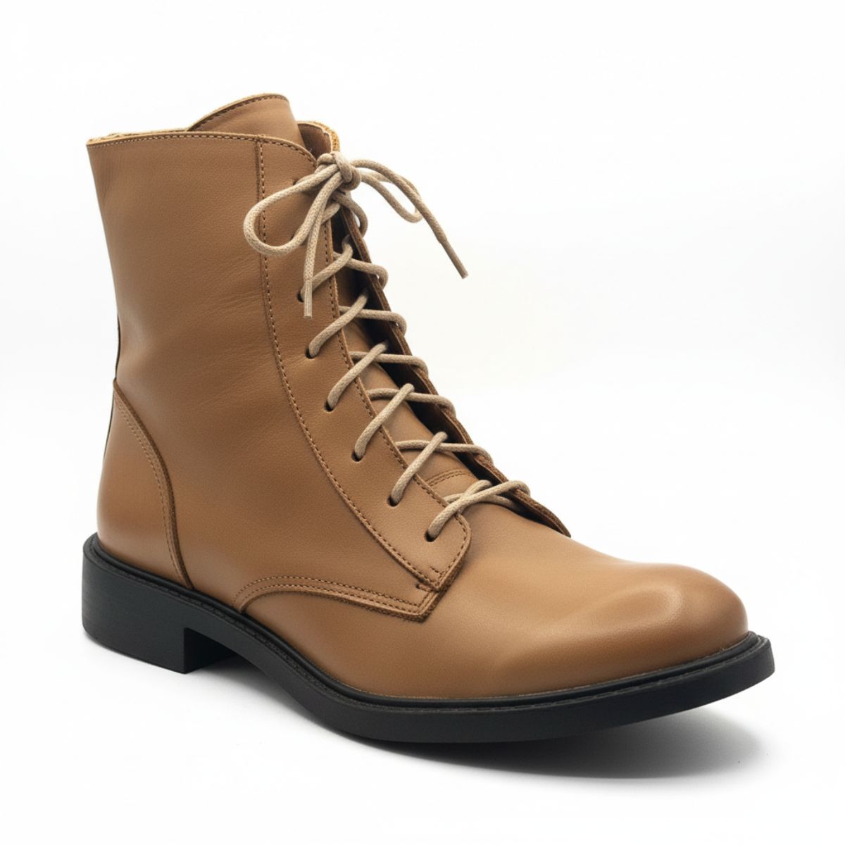 O fechamento é feito por cadarços frontais no mesmo tom do couro, permitindo um ajuste perfeito ao pé e à perna. O bico arredondado assegura o conforto necessário para o uso diário, e o logo da marca discretamente gravado na lateral do cano confere autenticidade ao produto.