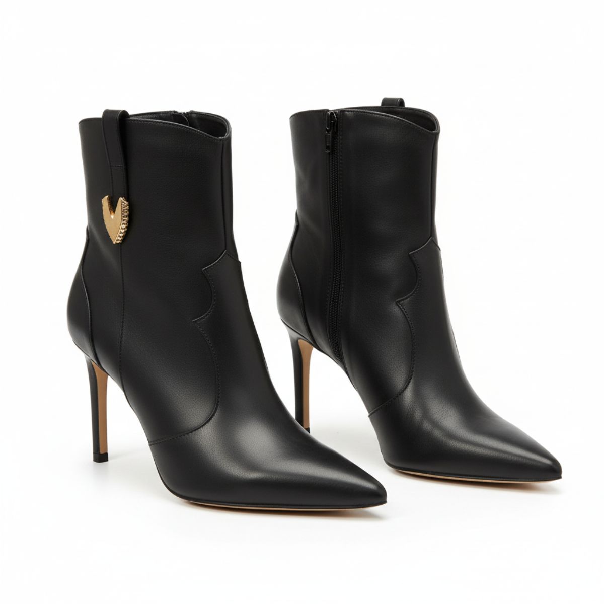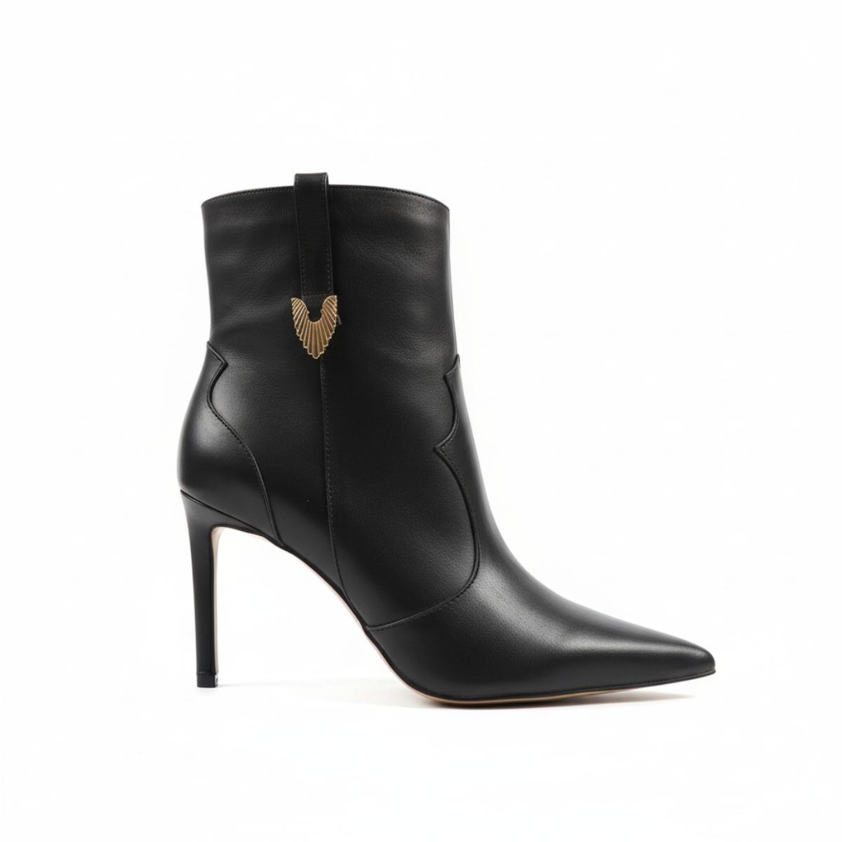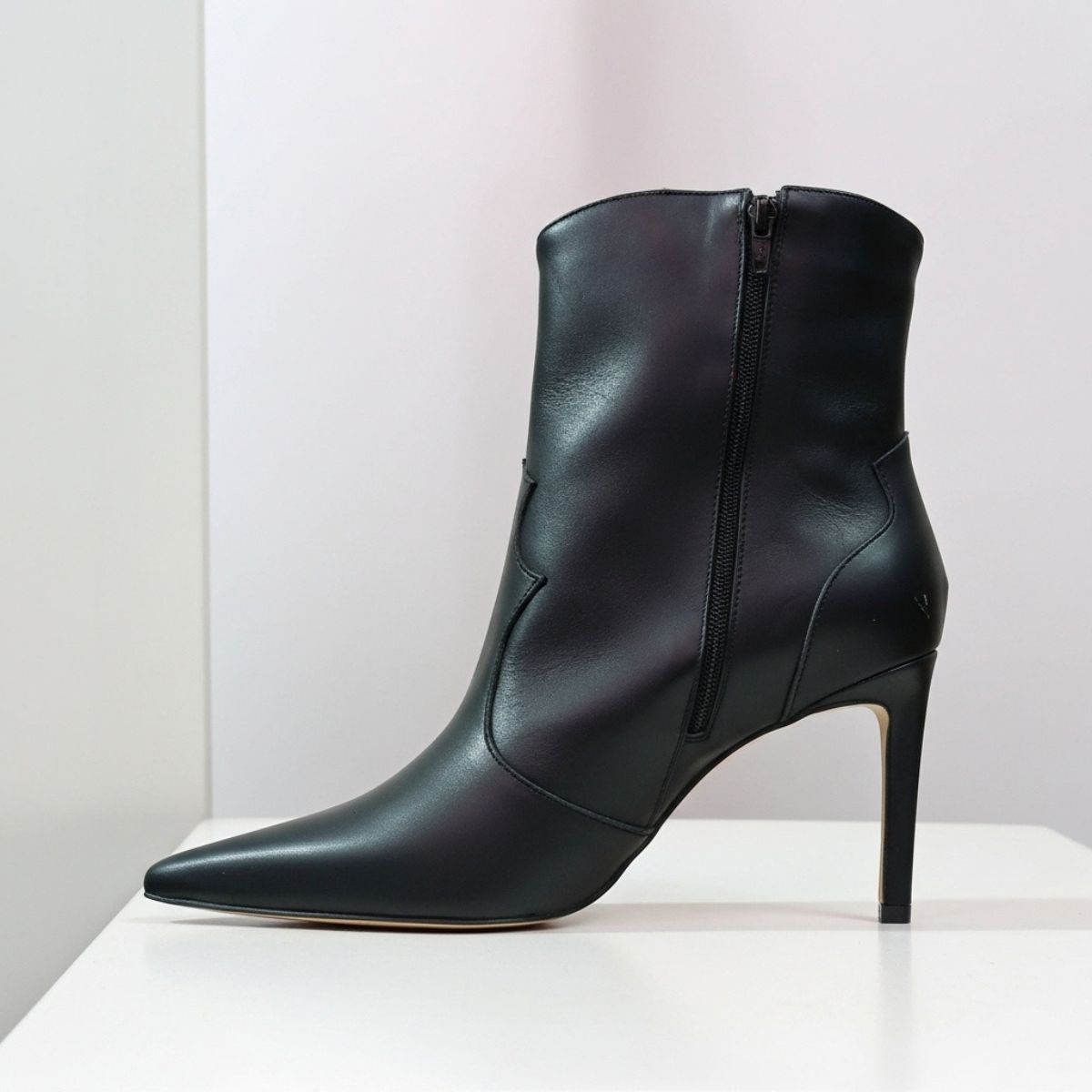 Aposte na sofisticação atemporal com esta bota ankle boot preta. Uma peça-chave que combina elegância e um toque de ousadia, perfeita para elevar qualquer look. Seu design em couro liso de alta qualidade destaca-se pelo bico fino e o salto alto stiletto, que juntos criam uma silhueta feminina e poderosa.