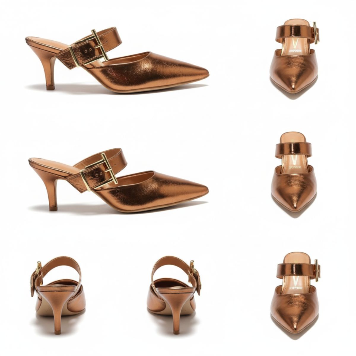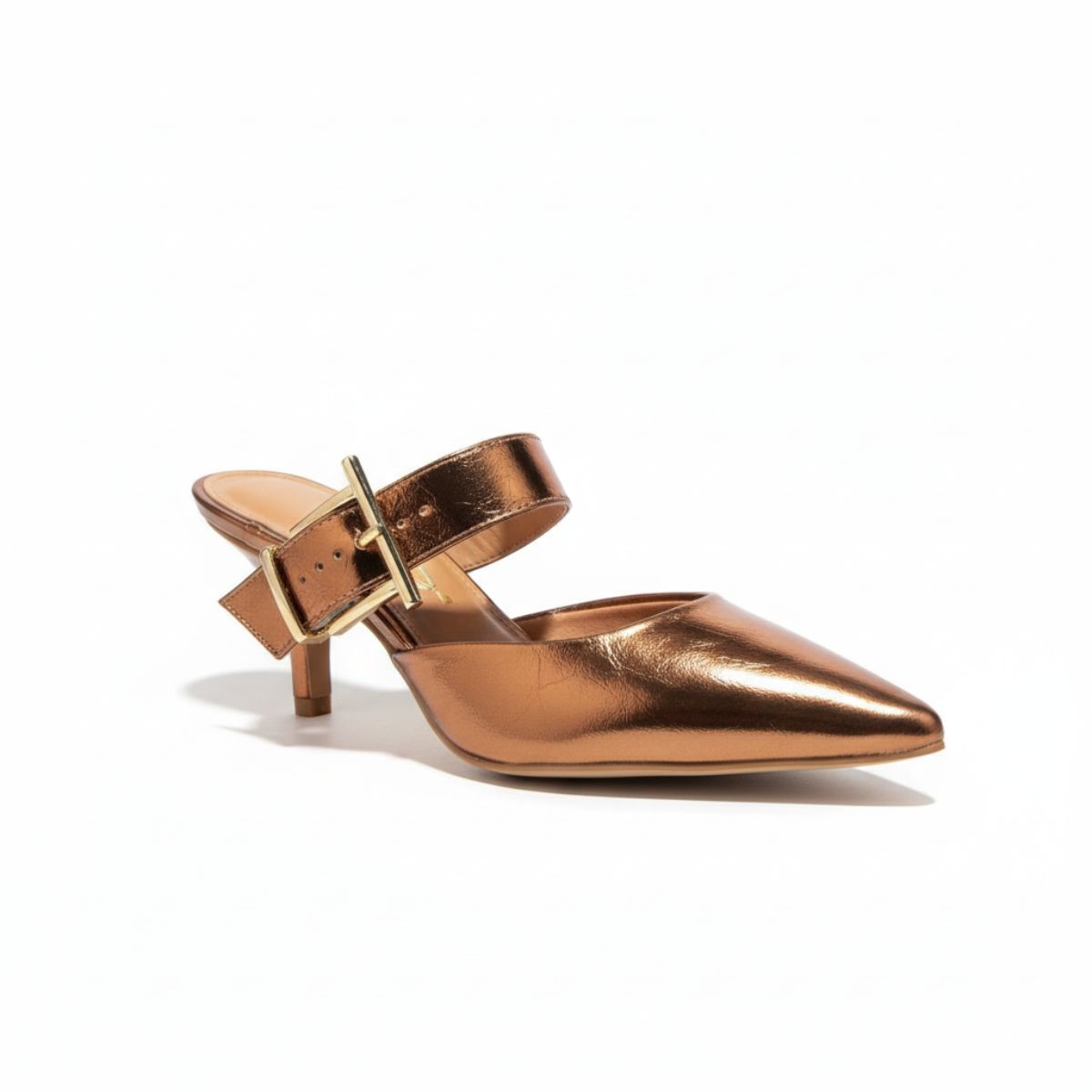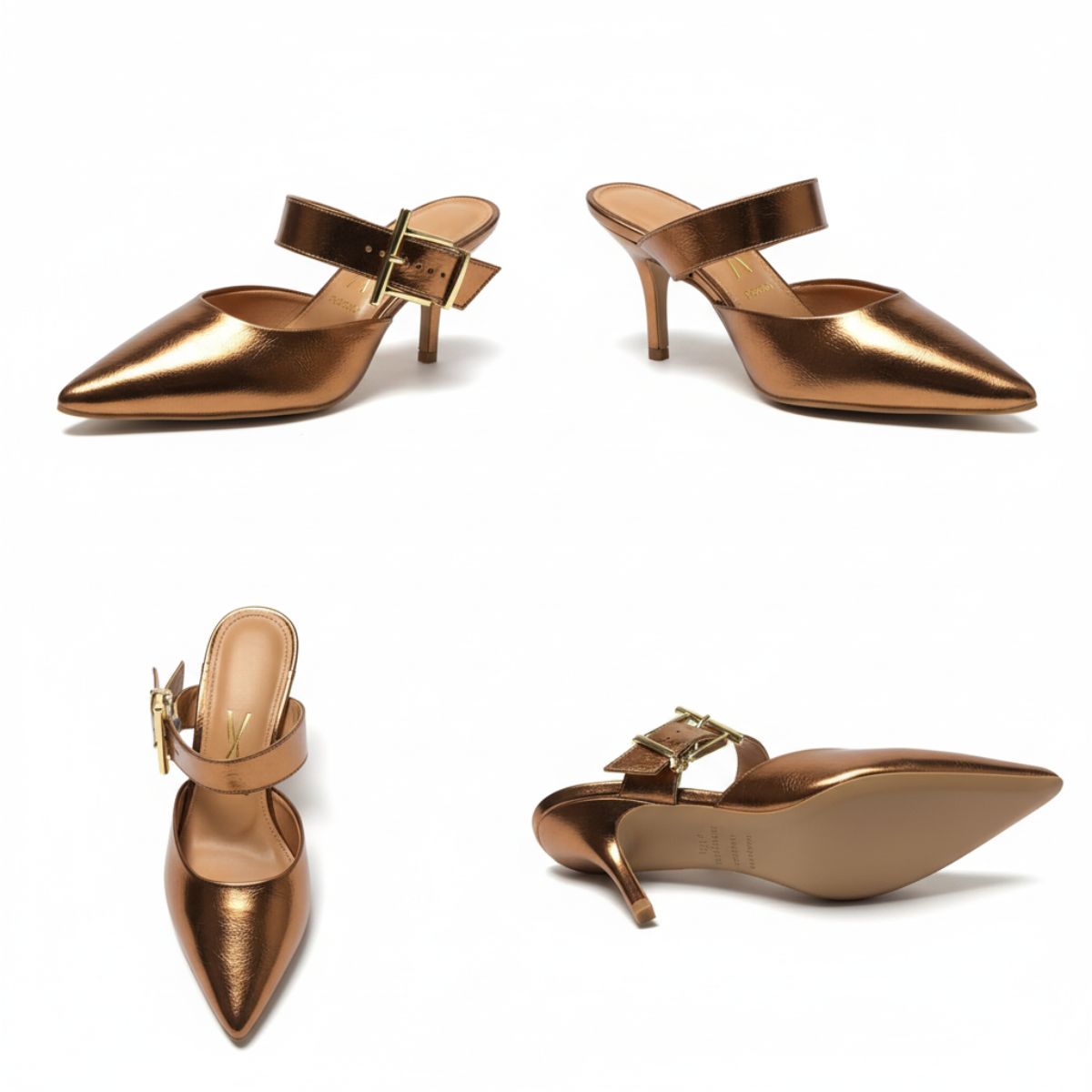 A tendência metalizada encontra a elegância clássica. Este mule em tom bronze acobreado possui bico fino, salto delicado e uma fivela statement, garantindo um visual moderno e luxuoso para qualquer ocasião.