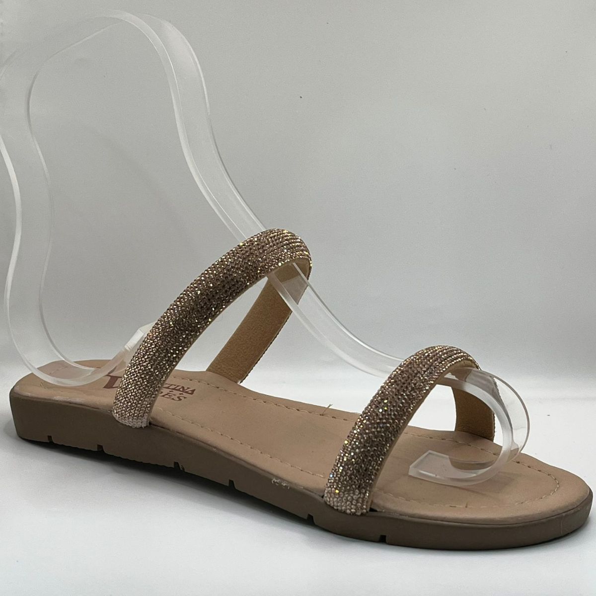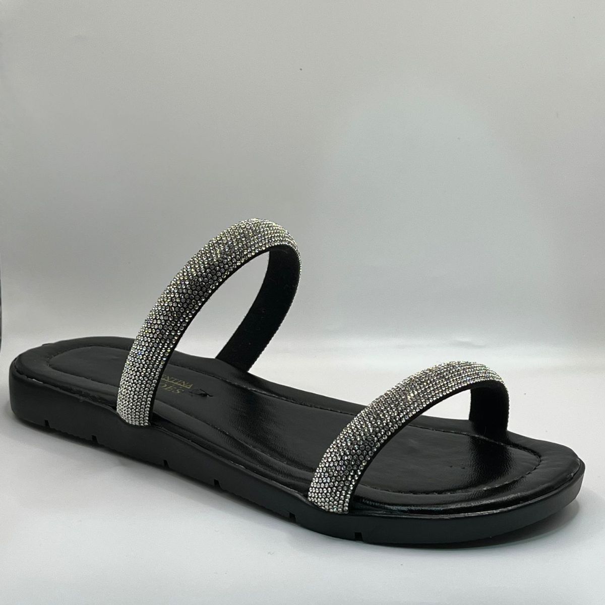 Esta sandália rasteira combina conforto e glamour, sendo a escolha perfeita para quem deseja adicionar um toque de brilho e sofisticação ao look do dia a dia ou a eventos casuais.