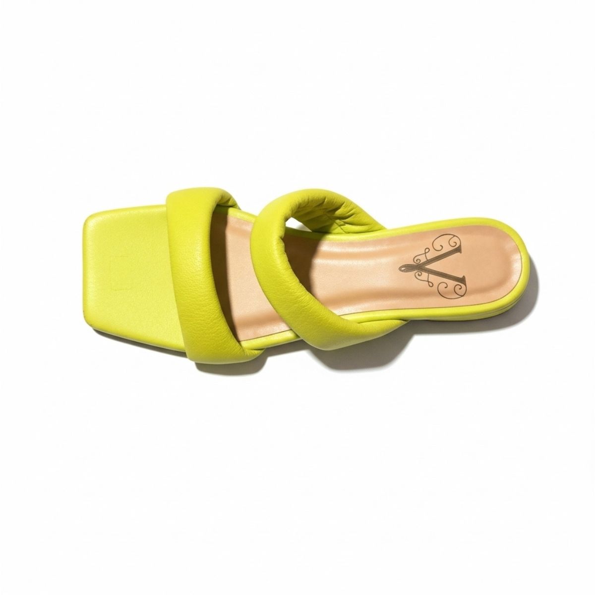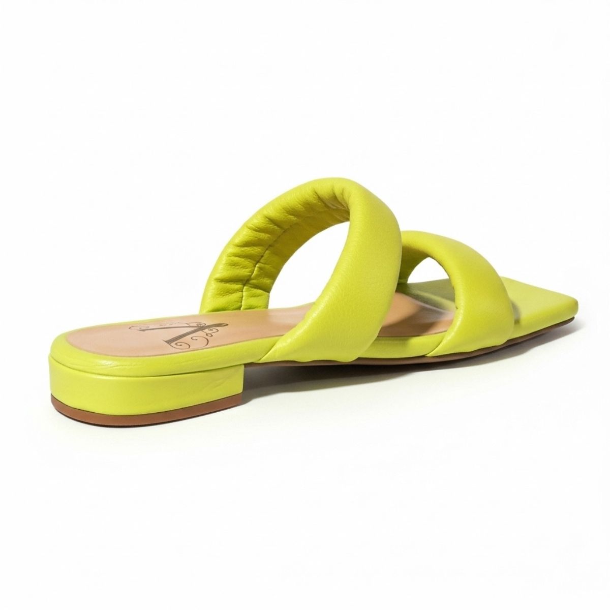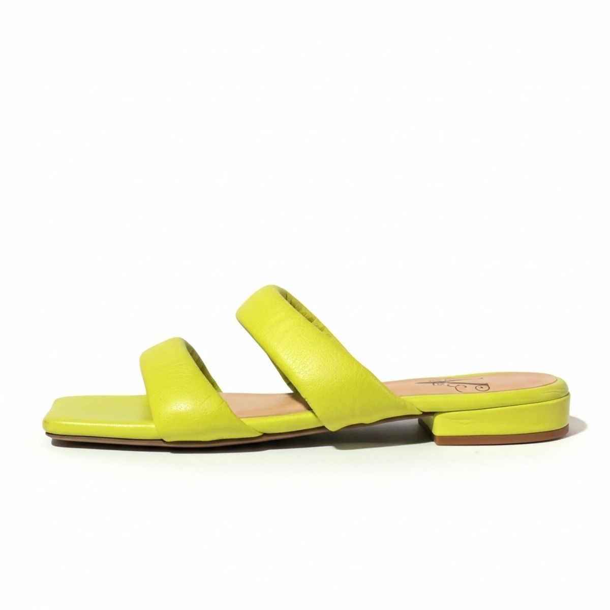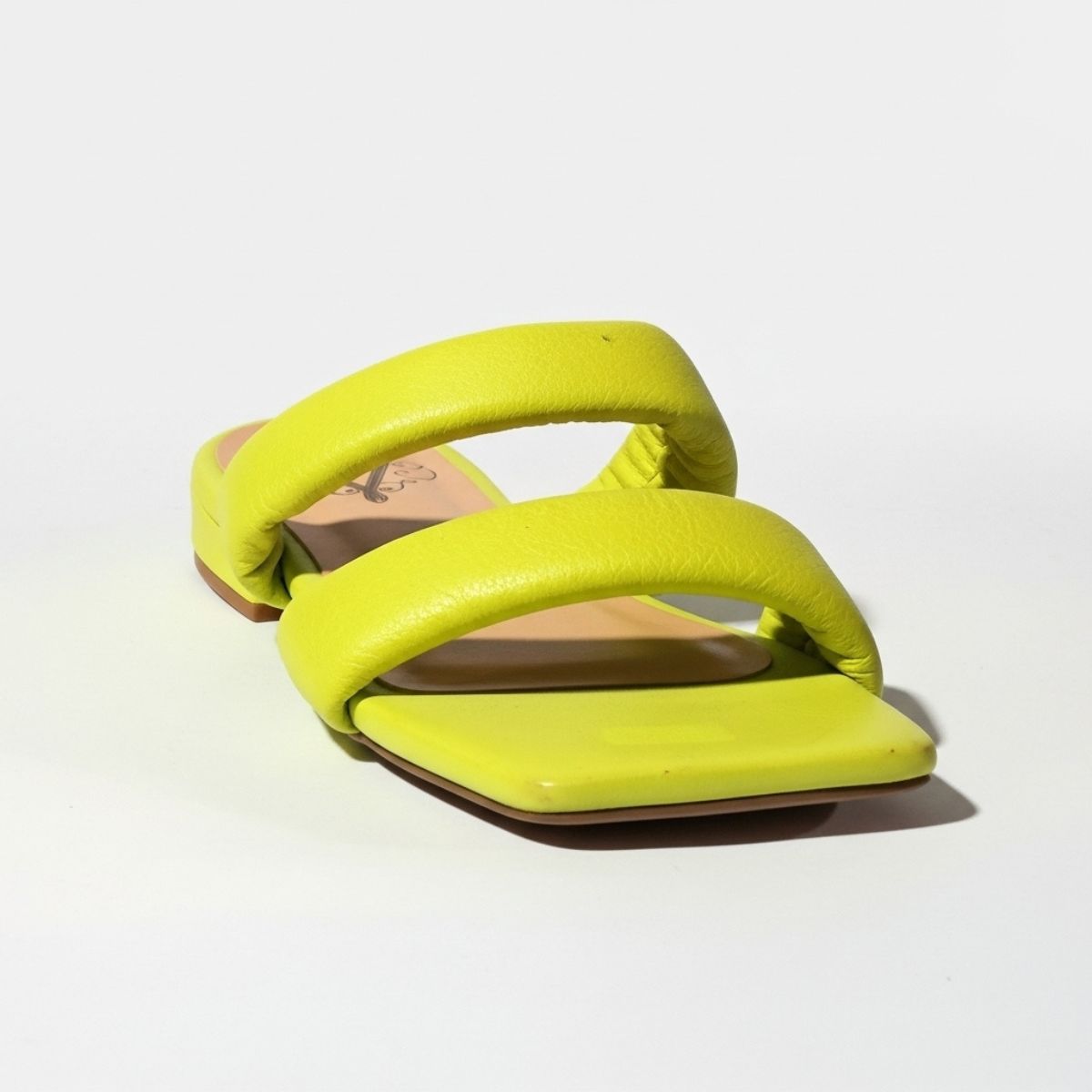 • Sandália Rasteira Feminina Slide Verde Lima Neon com Tiras Duplas Acolchoadas (Puffy) e Bico Quadrado