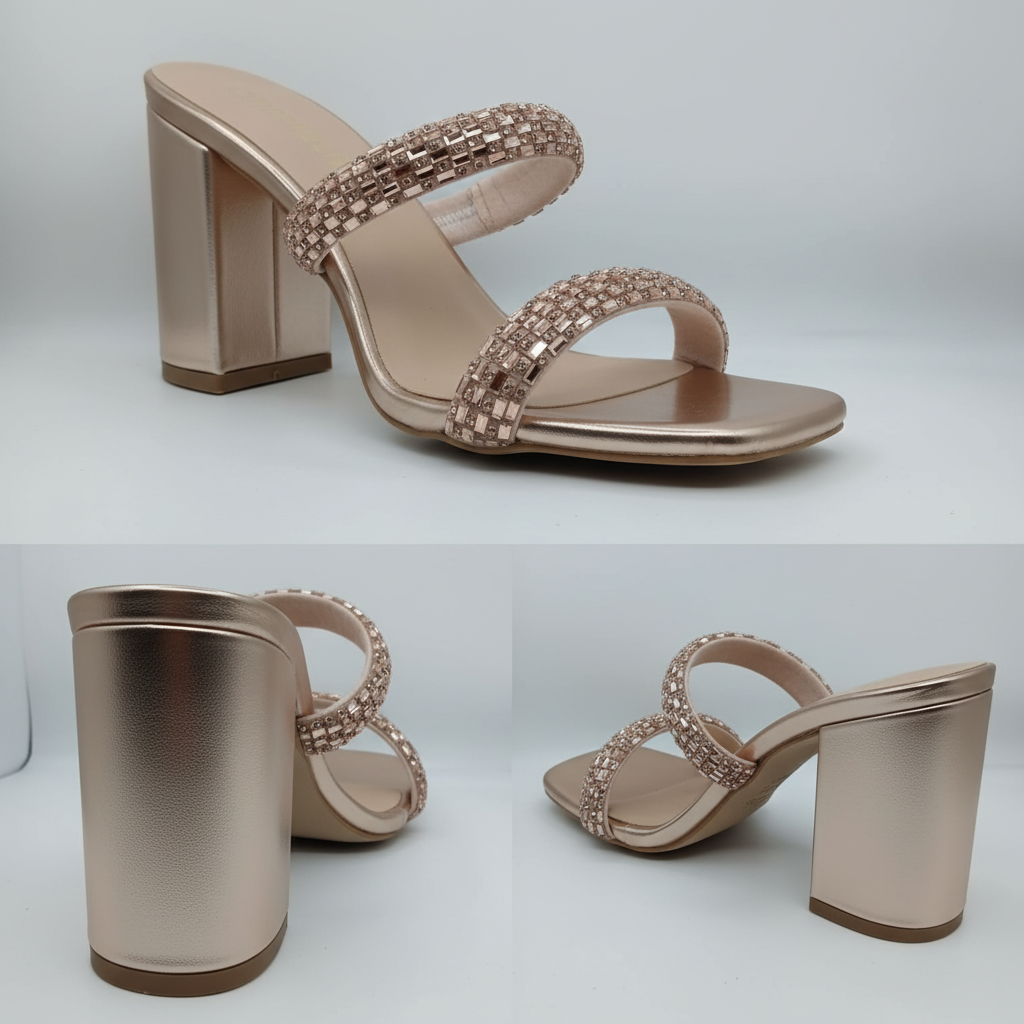 Seu design apresenta duas tiras macias inteiramente revestidas em strass (cristais), que captam a luz a cada movimento. O salto grosso (bloco) oferece estabilidade e segurança, permitindo que você aproveite festas e eventos por horas sem cansar os pés. O bico quadrado adiciona um toque de modernidade e tendência à peça.