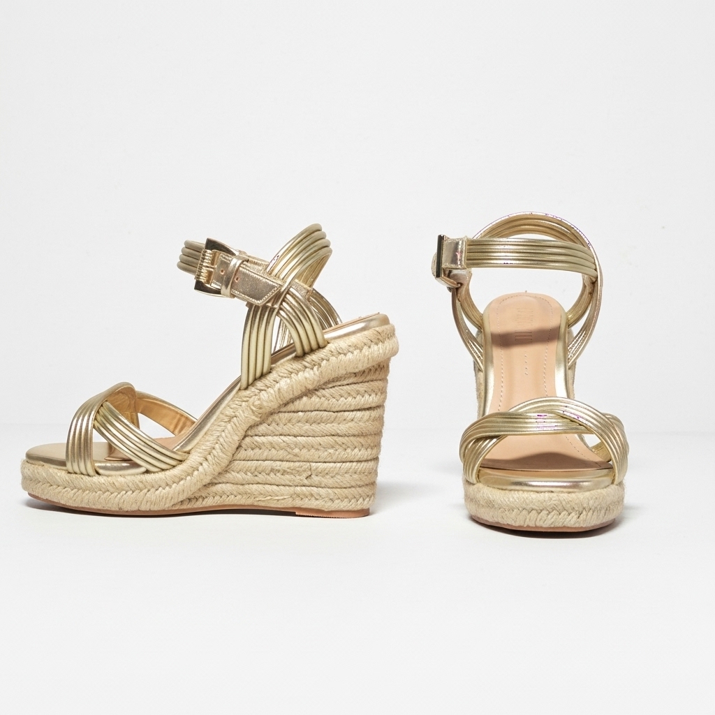 Sandália Anabela Espadrille Dourada Metalizada com Salto em Corda e Tiras Tubulares