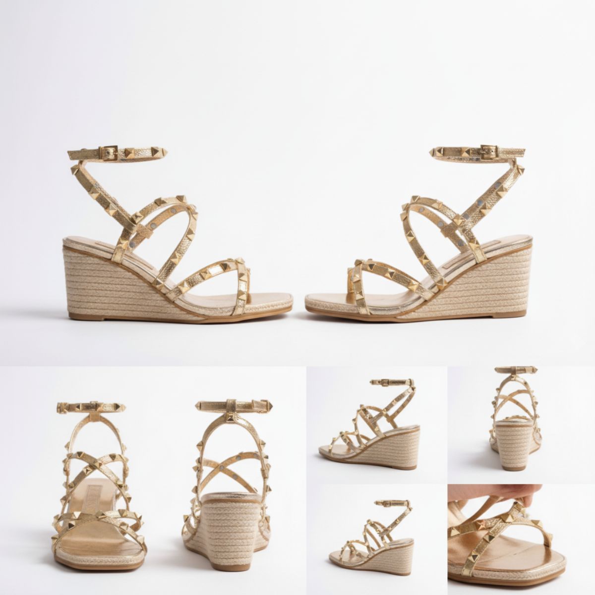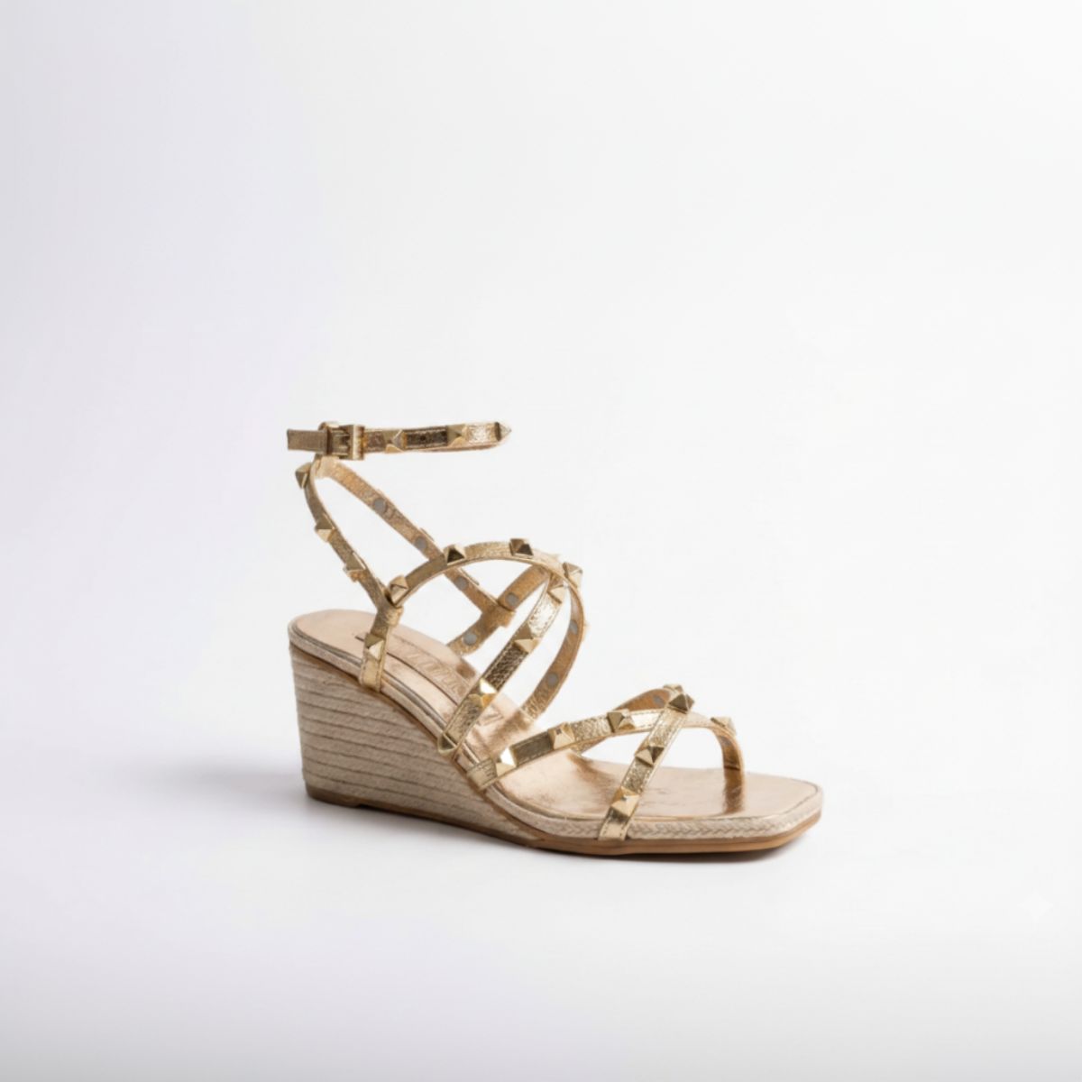 Adicione um toque de glamour moderno ao seu visual com esta sofisticada Sandália Anabela. O modelo combina a leveza rústica do salto espadrille com a ousadia das tachas piramidais, criando um calçado versátil que transita perfeitamente do dia para a noite.