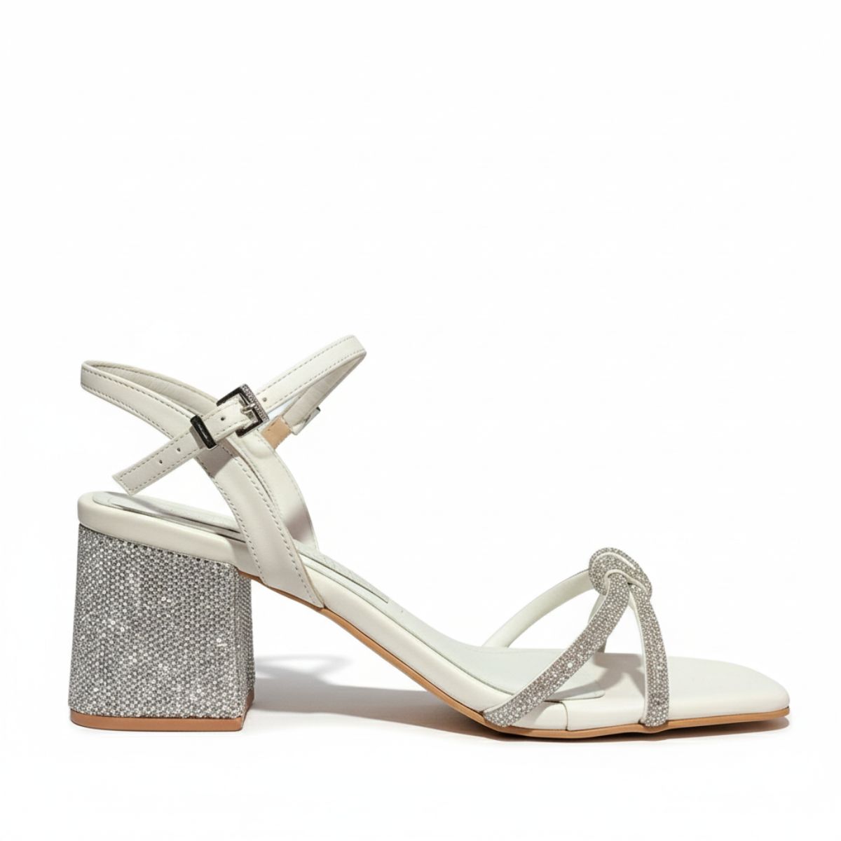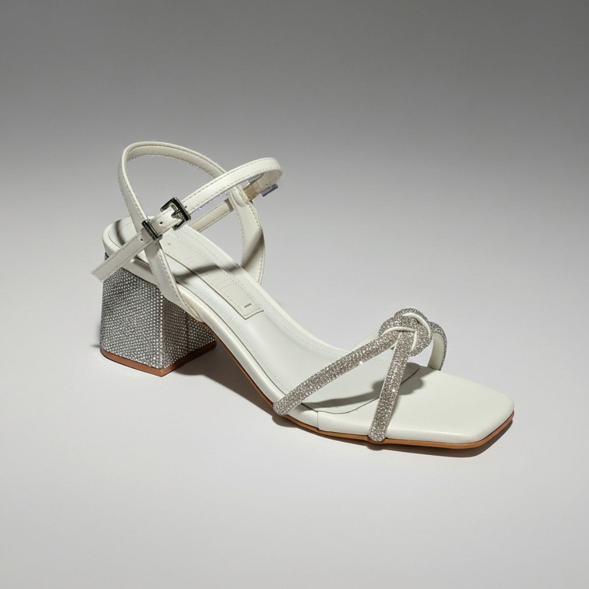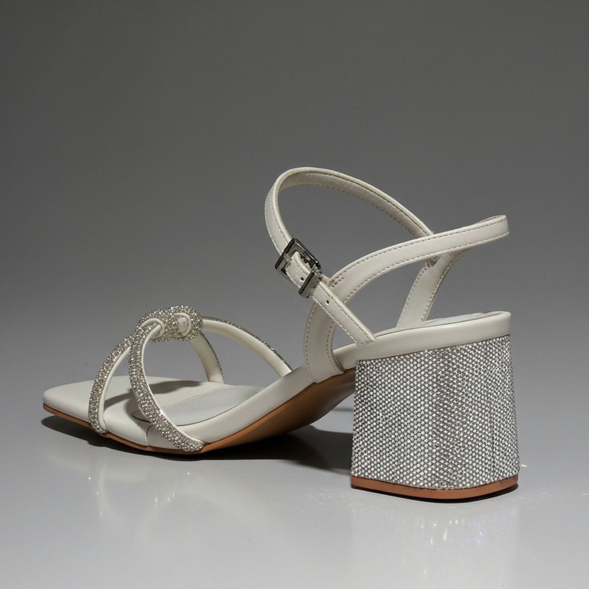 Tira Frontal Luxuosa: As tiras frontais são entrelaçadas em um delicado nó e também são revestidas em strass, harmonizando perfeitamente com o brilho do salto.
