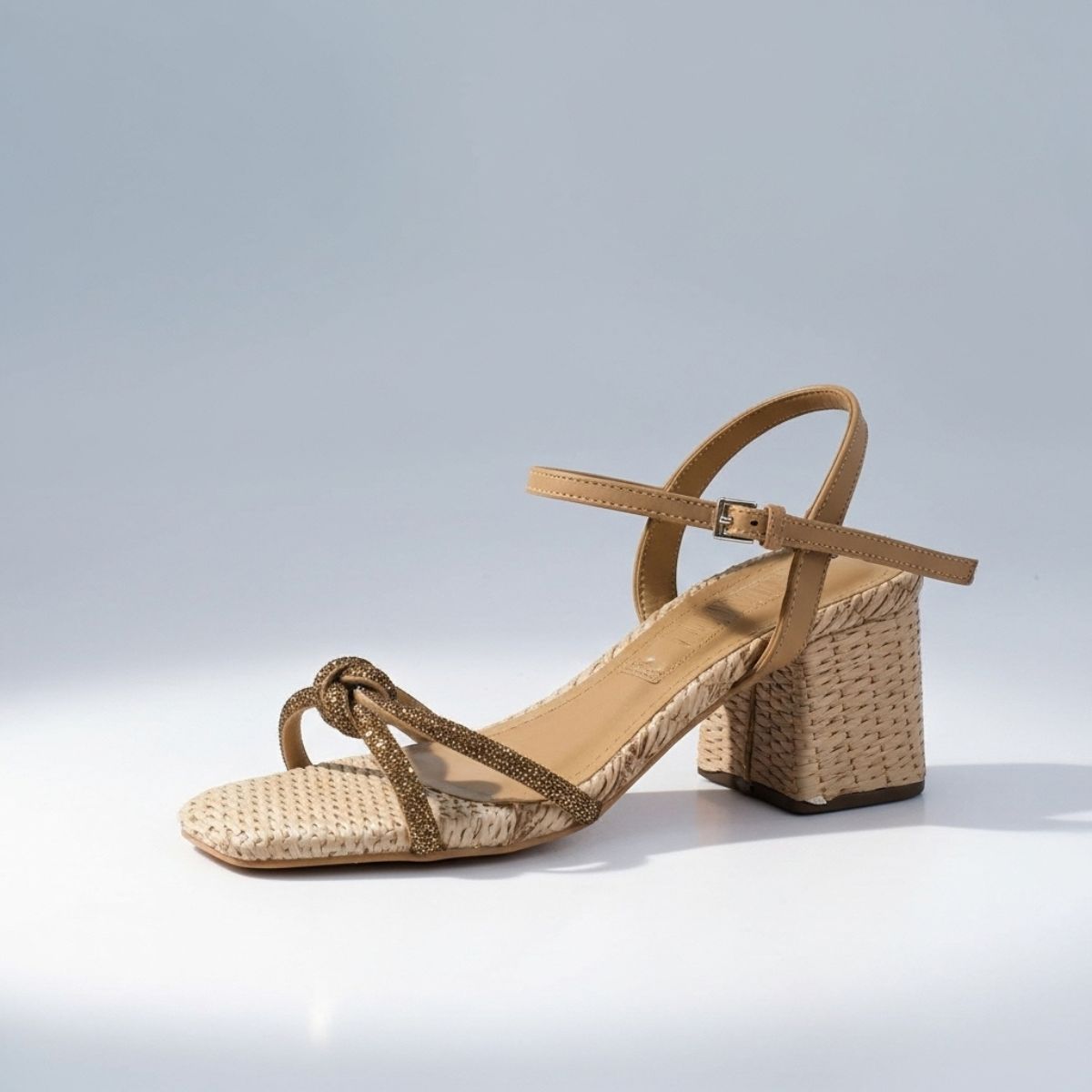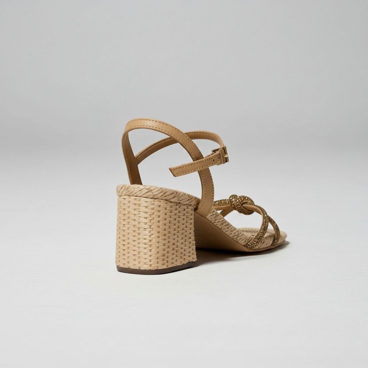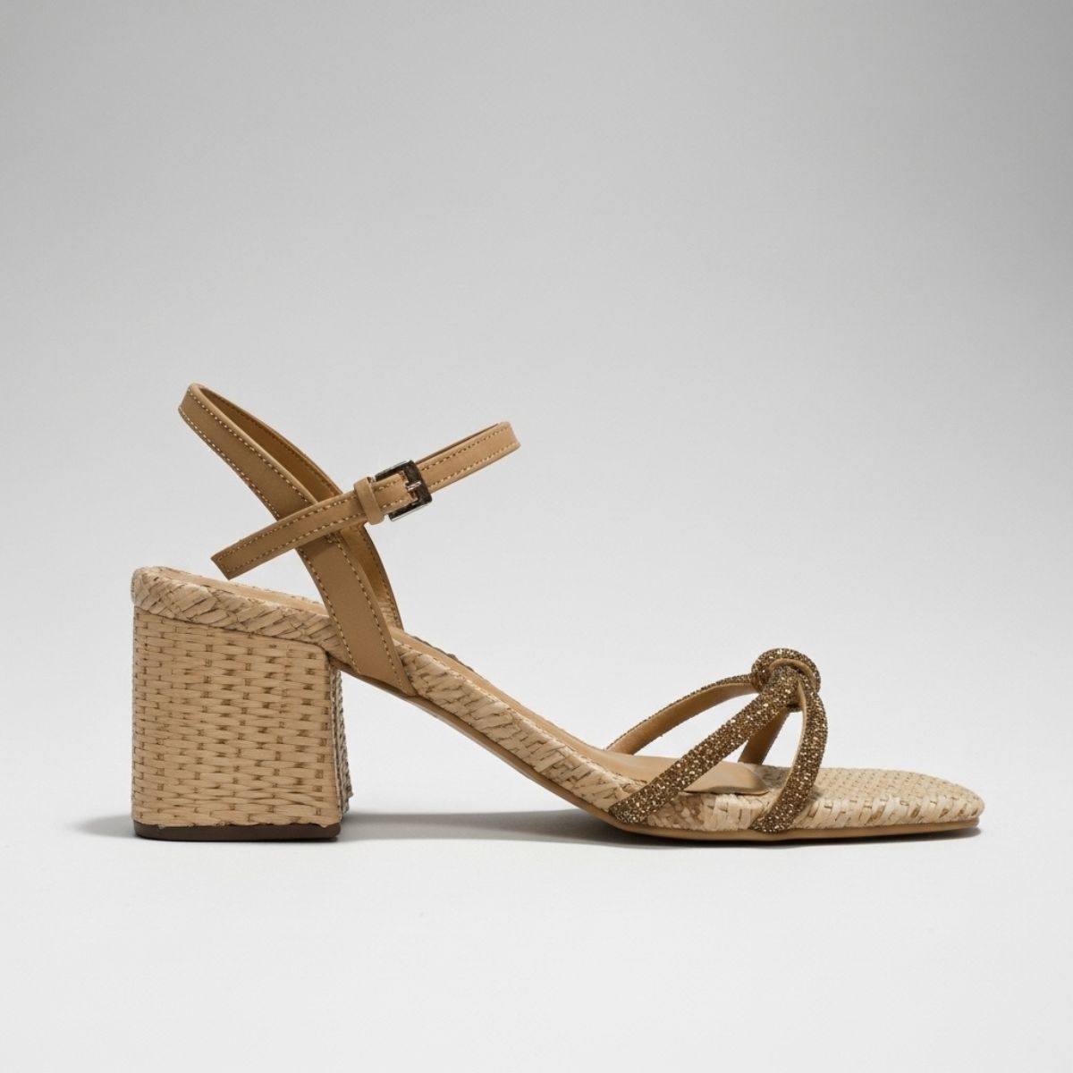 Toque de Glamour: A tira frontal em Nó é revestida em Strass (tom dourado/champagne), que adiciona um ponto de brilho sofisticado, contrastando com a ráfia e elevando a peça para ocasiões de festa diurnas.