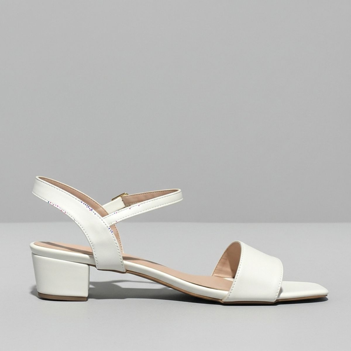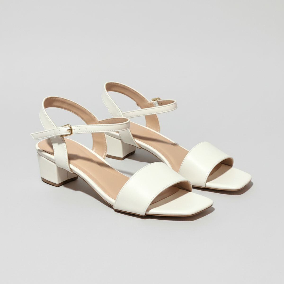 Sandália Feminina Salto Bloco Baixo Off-White Minimalista com Bico Quadrado