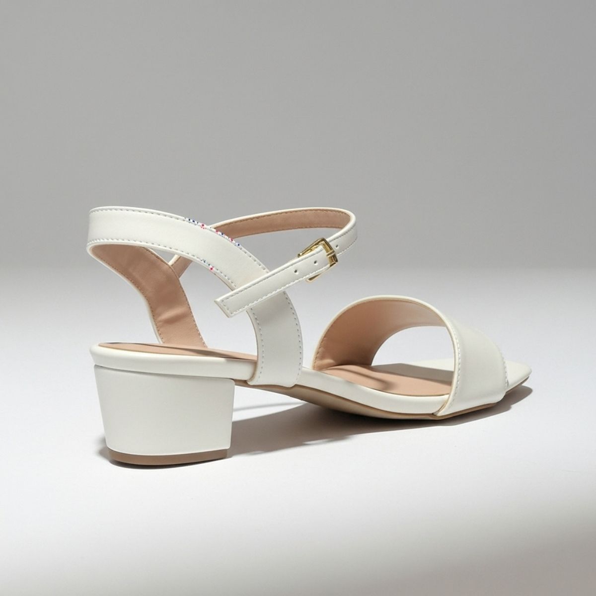 Modelo: Sandália de Salto Baixo / Salto Bloco. Cor: Branco / Off-White (Tom neutro e suave). Material (Cabedal): Confeccionado em material sintético (napa) liso e macio.