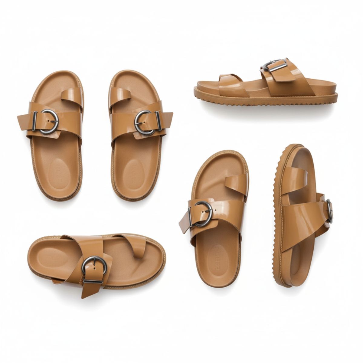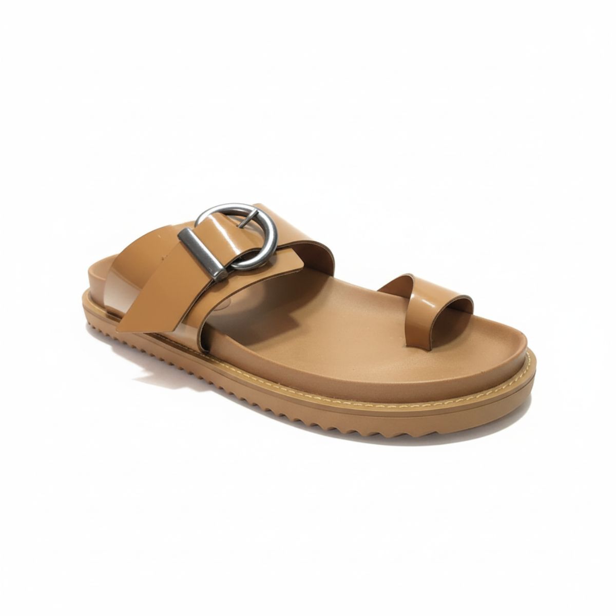 Modernidade e conforto em um só passo. Esta sandália flat na cor caramelo traz o acabamento sofisticado em verniz, solado tratorado leve e um detalhe de fivela que faz toda a diferença no visual.