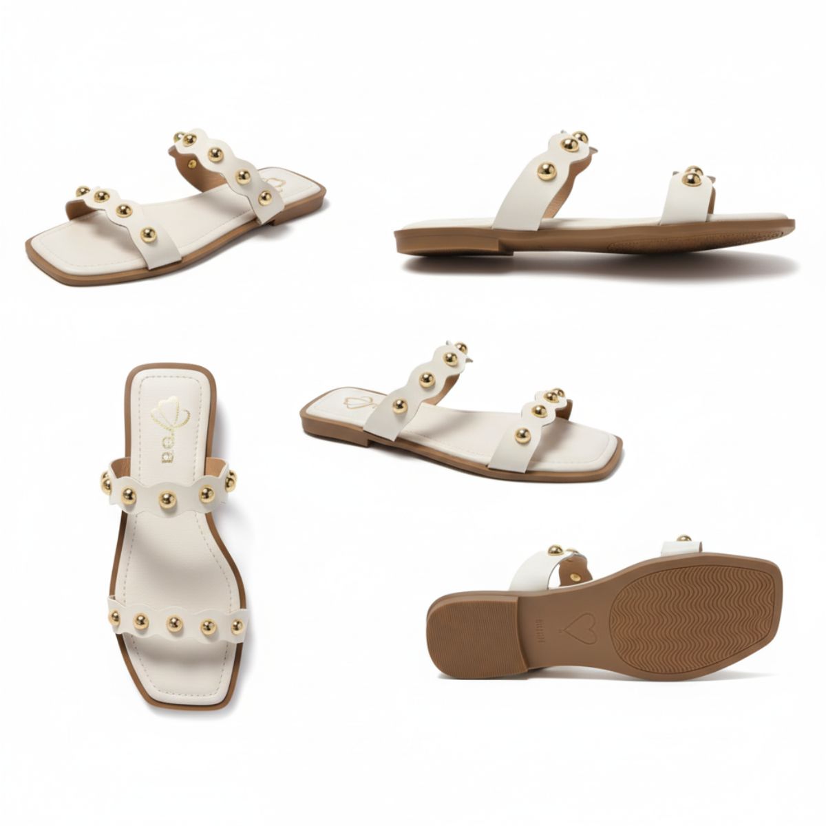 Esta sandália rasteira combina a leveza do branco com um design charmoso de tiras onduladas e tachas metálicas, resultando em uma peça delicada, mas com um toque de atitude.