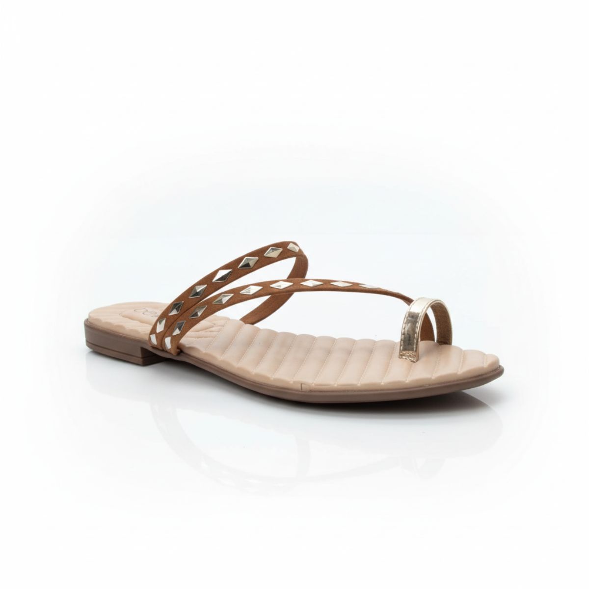 Una conforto e atitude em um único calçado. Esta rasteirinha é a definição de estilo “boho-chic” com uma pegada moderna. O modelo destaca-se pelo design diferenciado que mistura texturas: as tiras no peito do pé possuem acabamento aveludado (tipo camurça) na cor caramelo, decoradas com tachas (spikes) piramidais que trazem personalidade ao look.