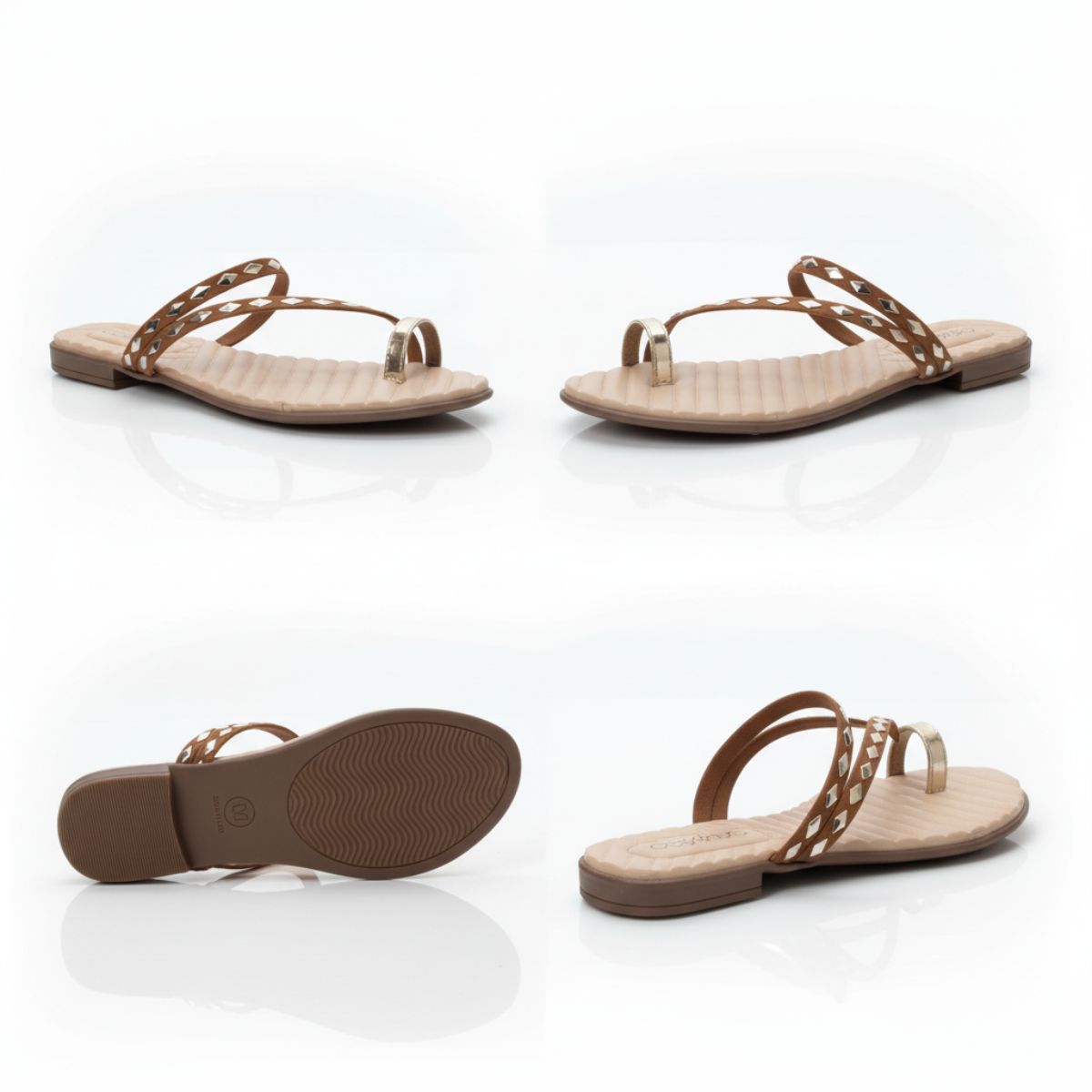 O charme final fica por conta da tira de dedo (toe loop) em material metalizado dourado, criando um ponto de luz sofisticado. Com uma palmilha macia e solado flat, é a companheira ideal para quem busca estar elegante sem abrir mão do bem-estar, seja num passeio à tarde ou em compromissos casuais.