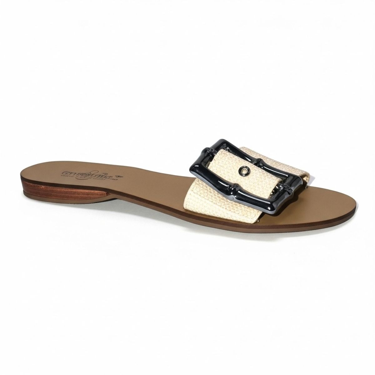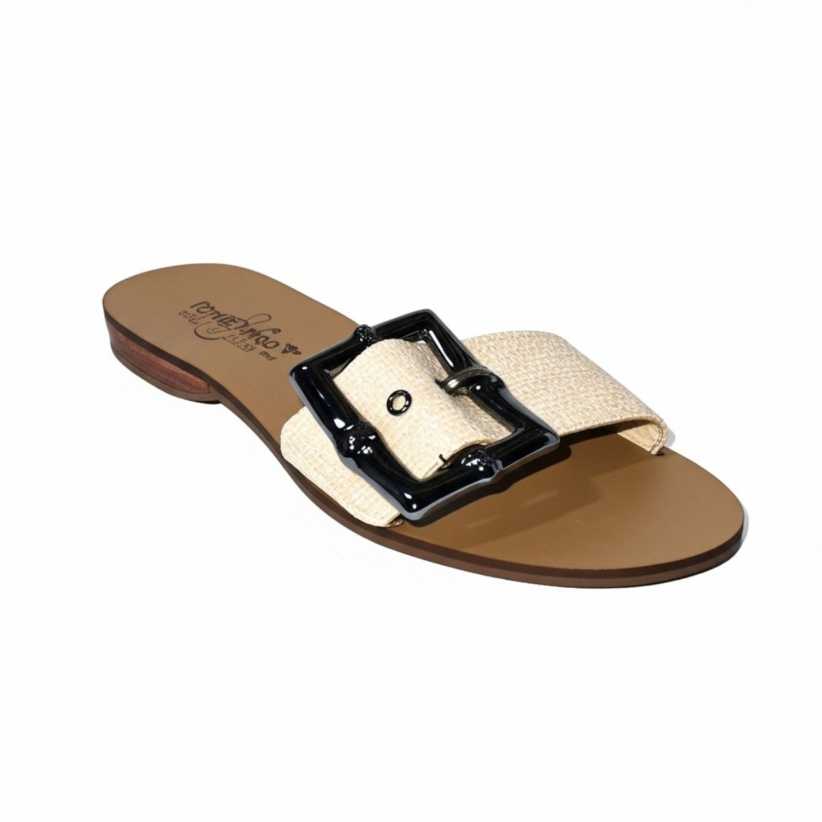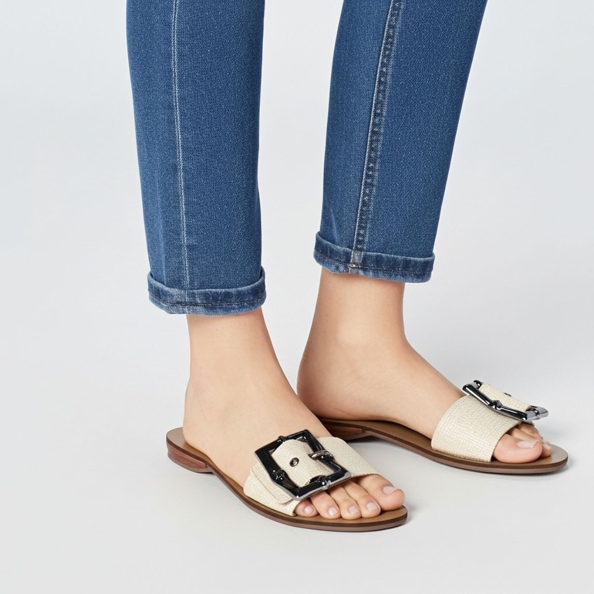 Sandália Rasteira Feminina Modelo Slide Bege com Textura de Palha e Maxi Fivela