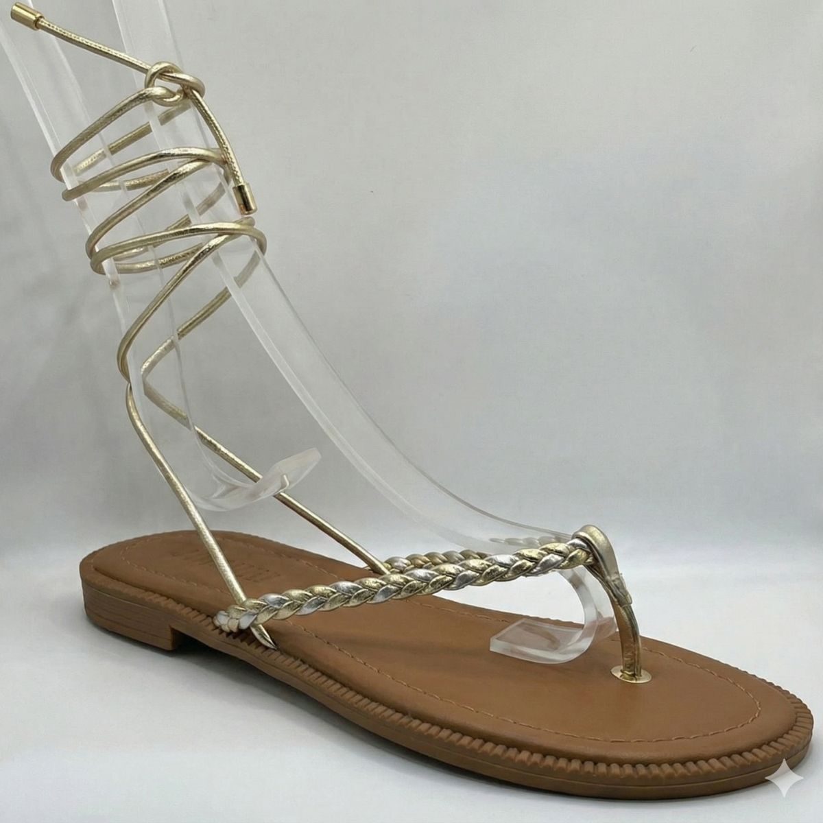 • Sandália Rasteira Feminina Estilo Gladiadora com Tira Trançada e Amarração no Tornozelo