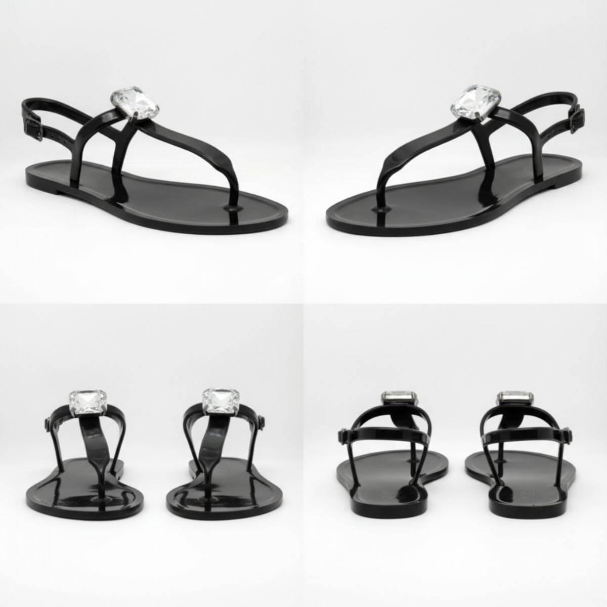 O protagonista indiscutível é o maxi cristal translúcido aplicado sobre a tira central. Com lapidação geométrica, a pedra capta a luz e cria um ponto de foco sofisticado, contrastando com a sobriedade do preto total. É a escolha ideal para quem busca praticidade sem abrir mão de um toque de joia nos pés.