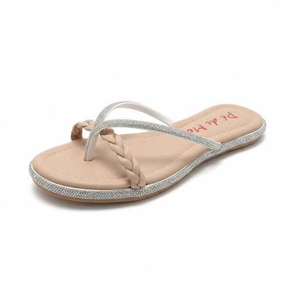 Sandália Rasteira Nude com Tiras de Strass e Detalhe Trançado