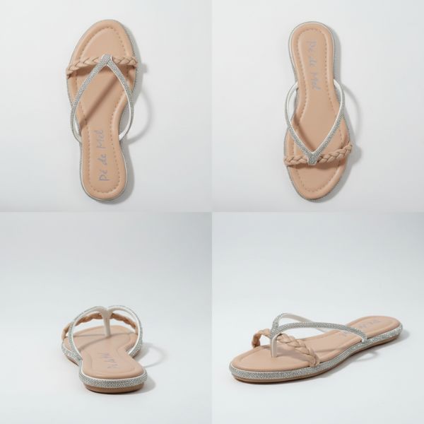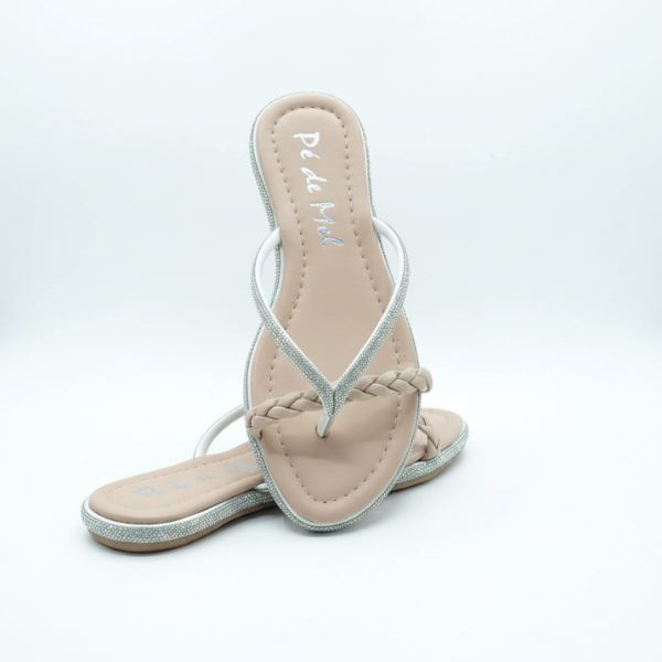 O modelo destaca-se pelo seu design sofisticado que combina texturas e brilho. Possui uma tira frontal trançada, que traz um toque artesanal e moderno, harmonizando perfeitamente com as tiras finas cruzadas revestidas em strass. O grande diferencial está no acabamento da sola: todo o contorno (vira) é decorado com uma manta de micro strass, garantindo luminosidade a cada passo.