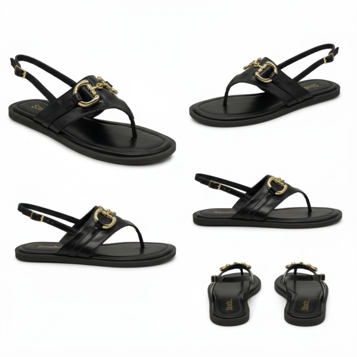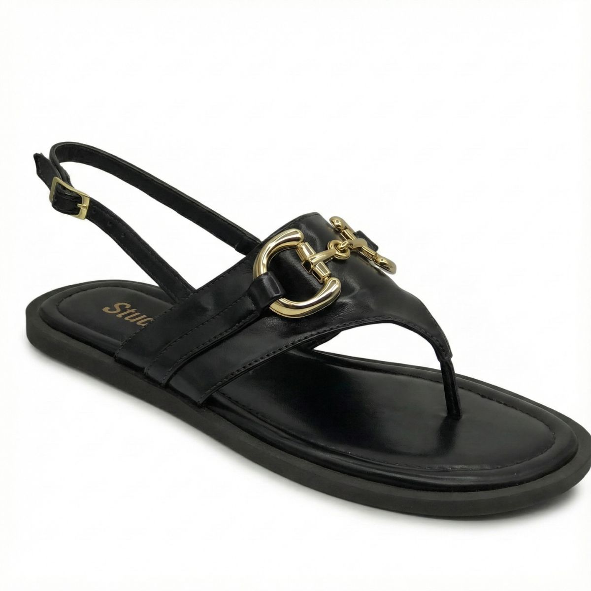 O destaque fica por conta do bridão metálico dourado na tira frontal, um detalhe luxuoso que eleva o visual, transformando uma sandália básica em uma peça de destaque. O acabamento em preto torna o calçado extremamente versátil, enquanto a palmilha anatômica sugere conforto prolongado.