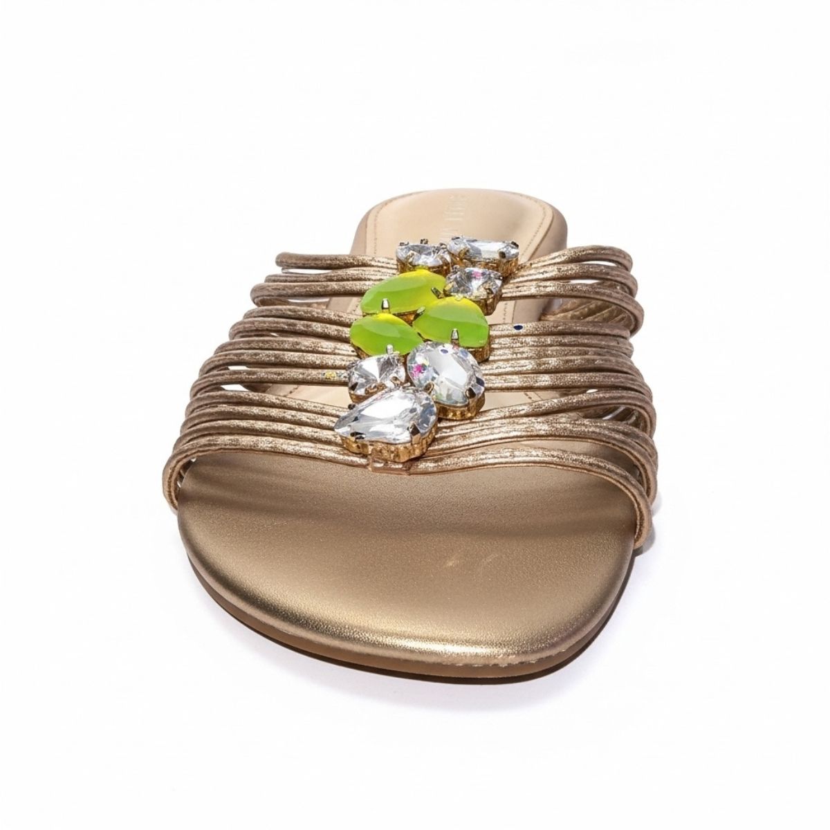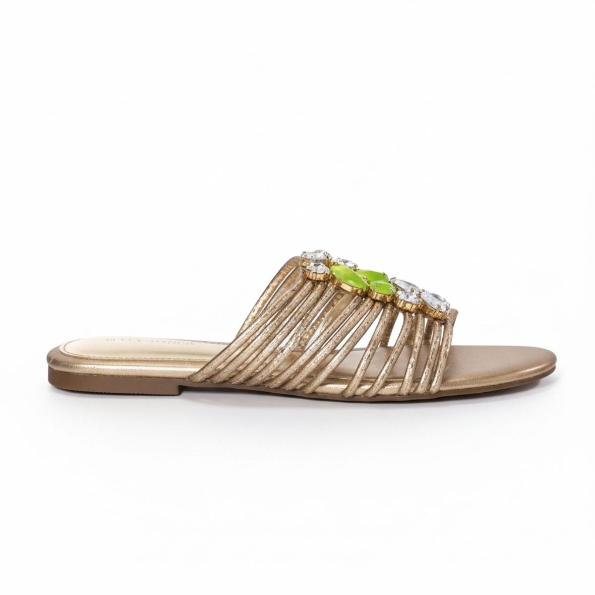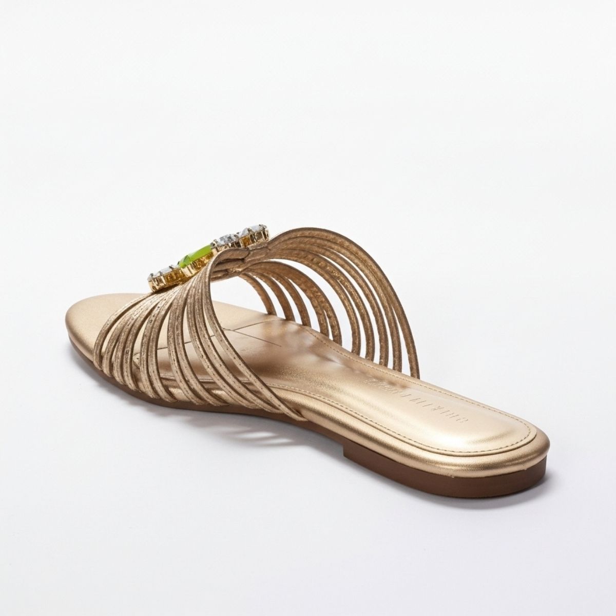 • Sandália Rasteira Feminina Slide Metalizada Dourada/Bronze com Multitiras e Aplicação de Pedrarias