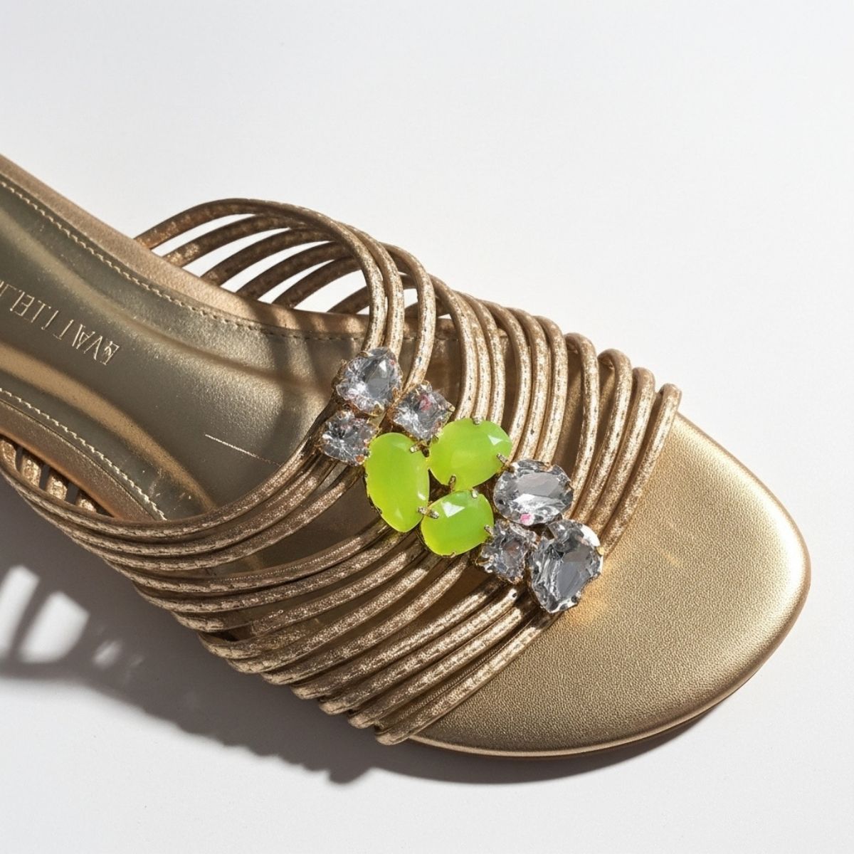 • Detalhe (Pedraria): O grande diferencial é o aplique central de pedrarias (cristais). O design mescla pedras transparentes (cristal) com pedras em tom verde limão/neon, criando um contraste moderno e iluminado sobre o fundo dourado.