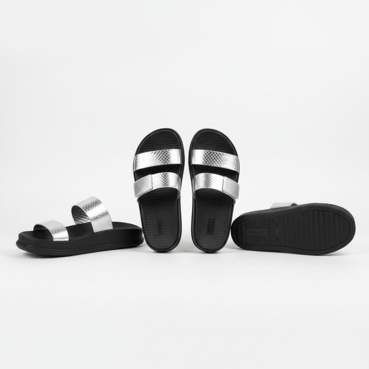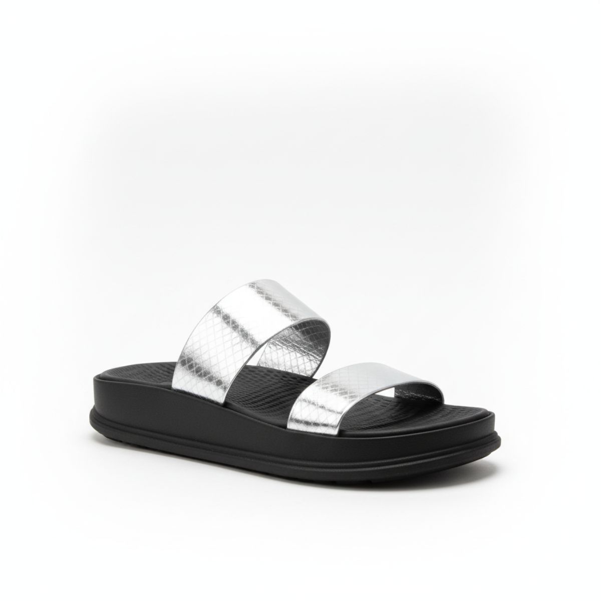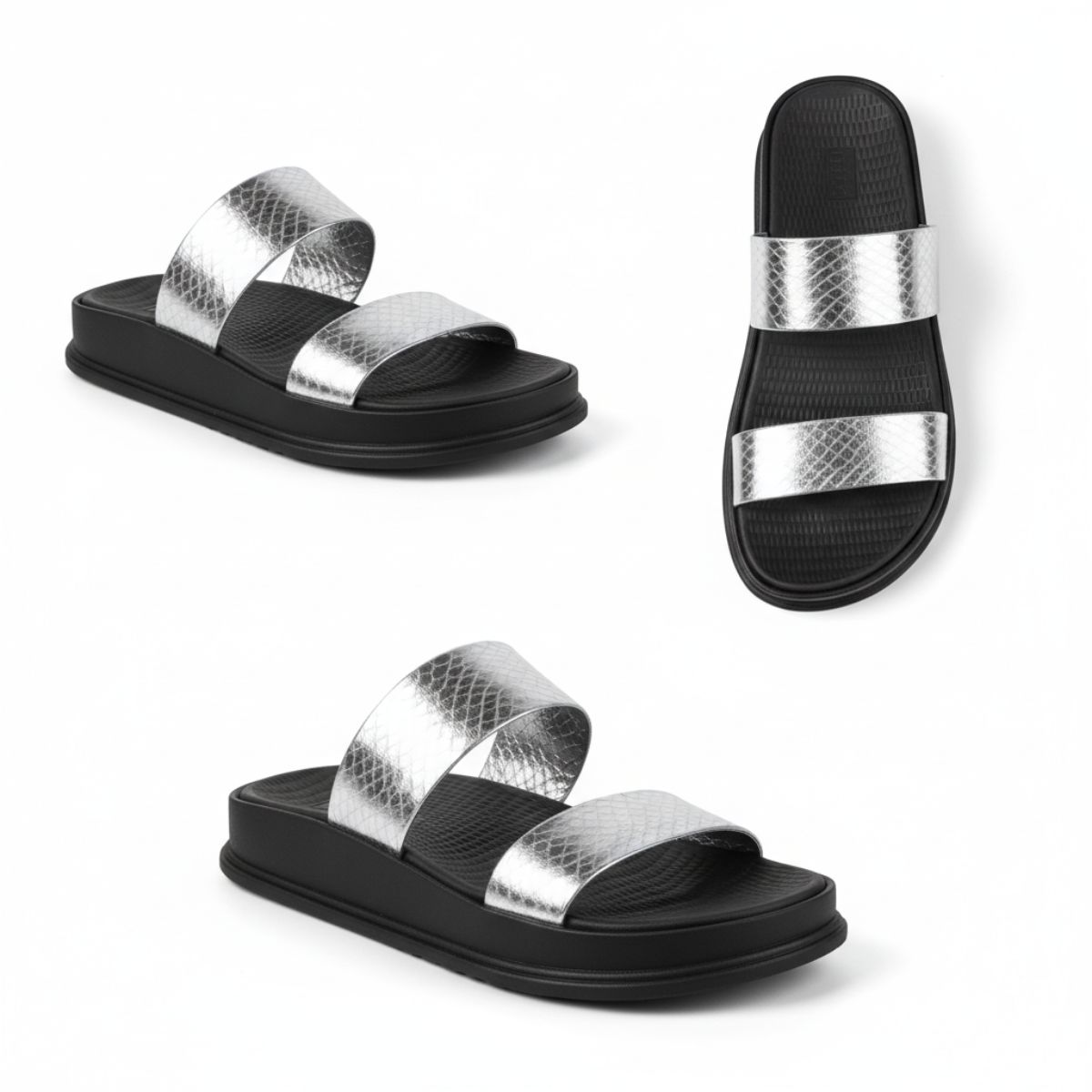 Esta sandália slide combina a *tendência do metalizado* com a *estabilidade do solado flatform* para criar um calçado moderno, ousado e extremamente confortável.