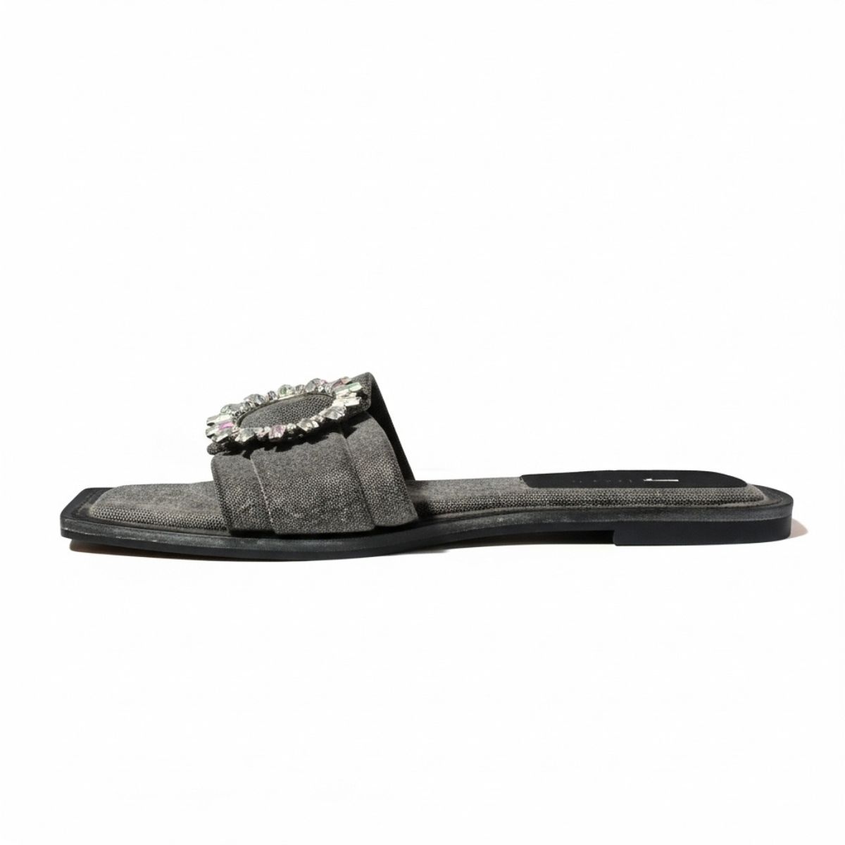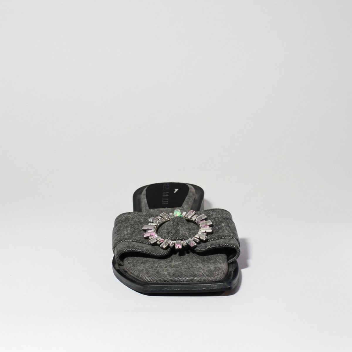 •  Sandália Rasteira Feminina Slide em Tecido Jeans Escuro com Maxi Aplique Circular de Pedrarias