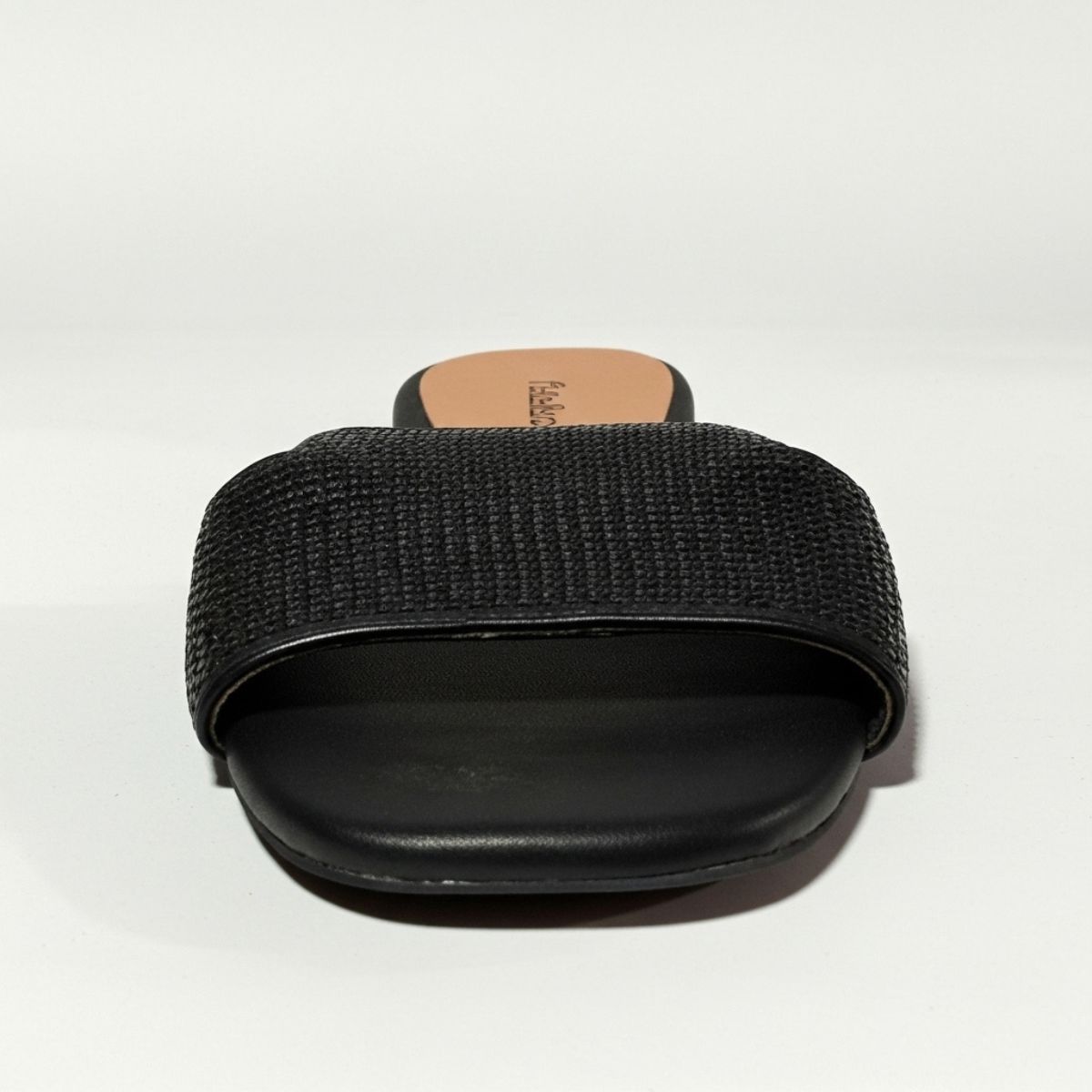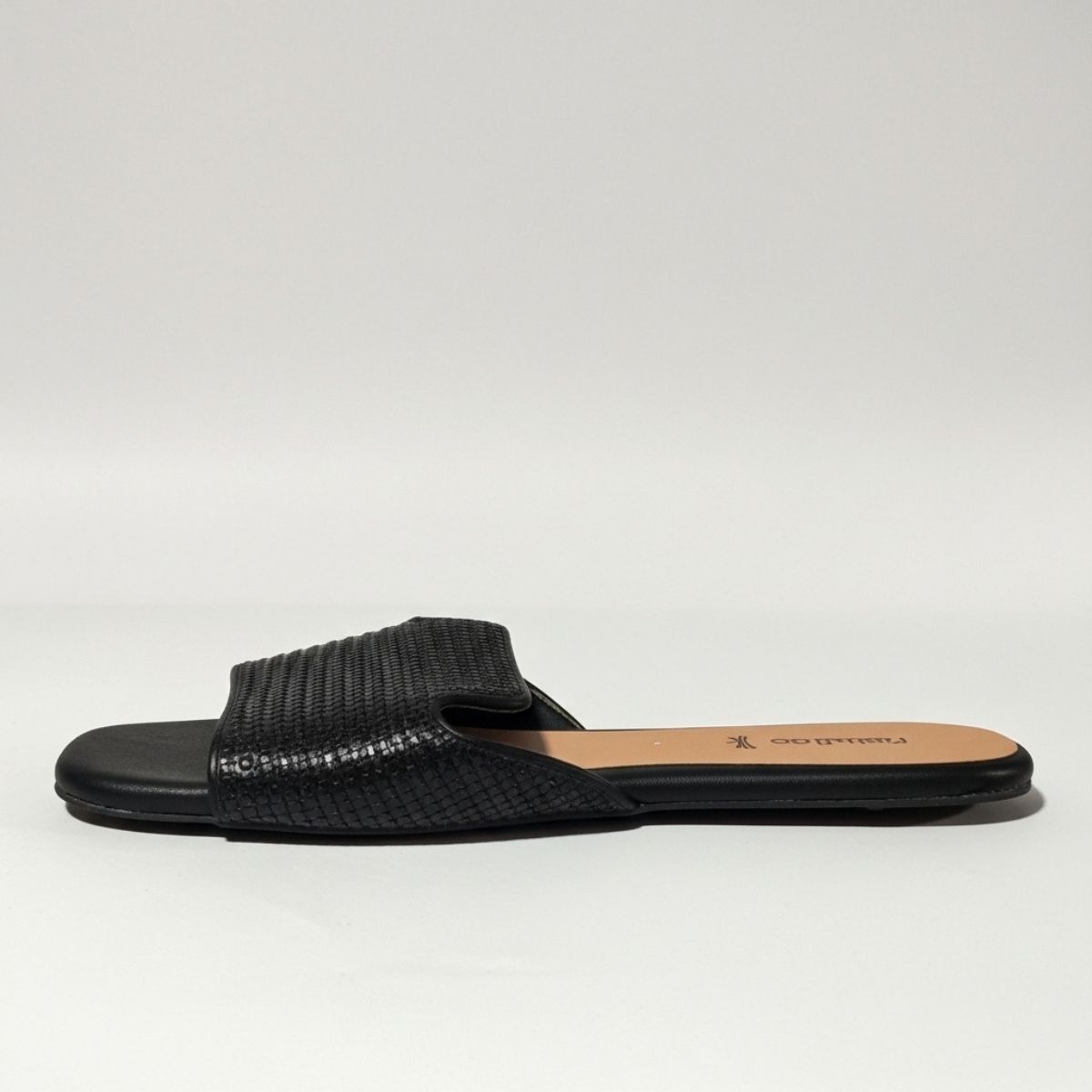 • Sandália Rasteira Feminina Modelo Slide Preta com Tira Larga Texturizada e Bico Quadrado