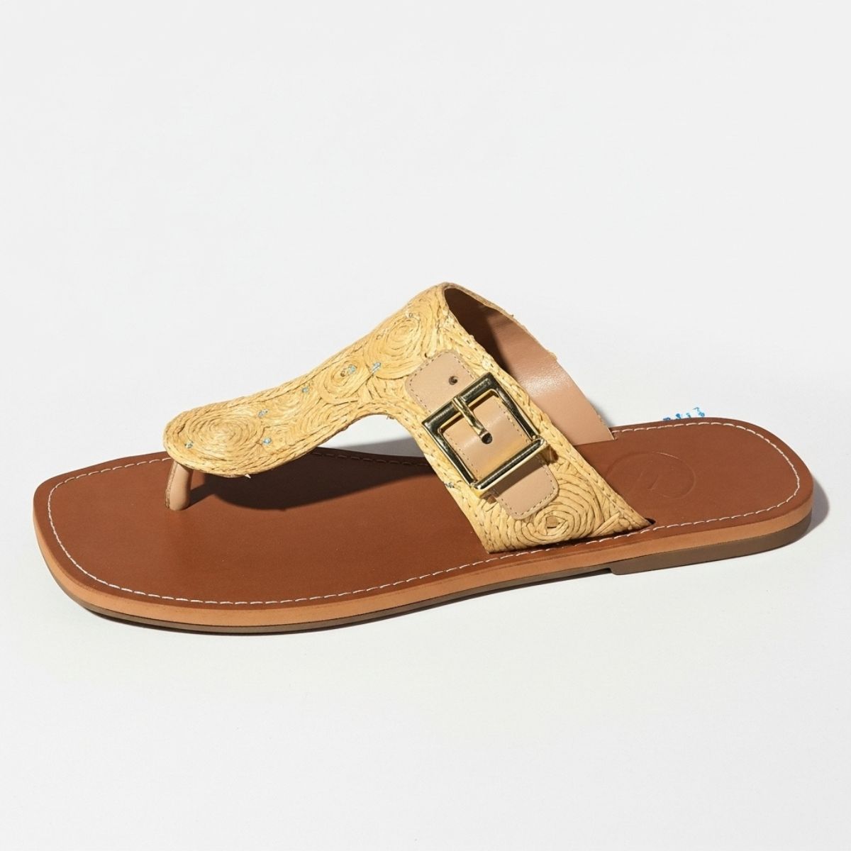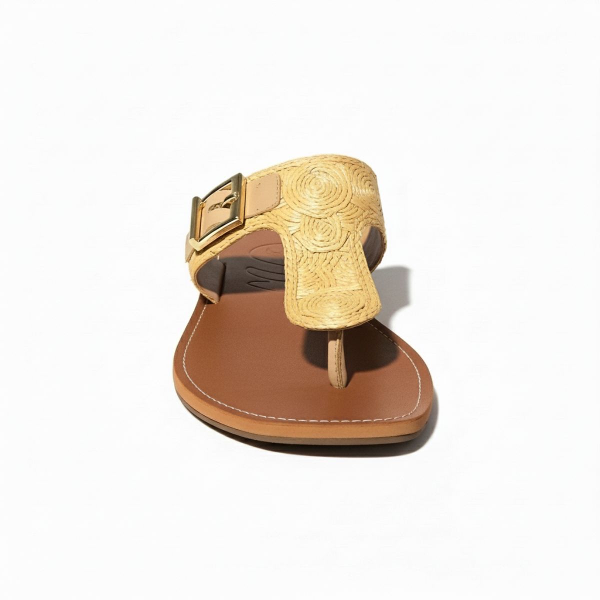 • Fivela: Possui uma fivela metálica dourada na lateral da tira, que serve como um ponto de luz e elegância, contrastando com o aspecto rústico da palha.