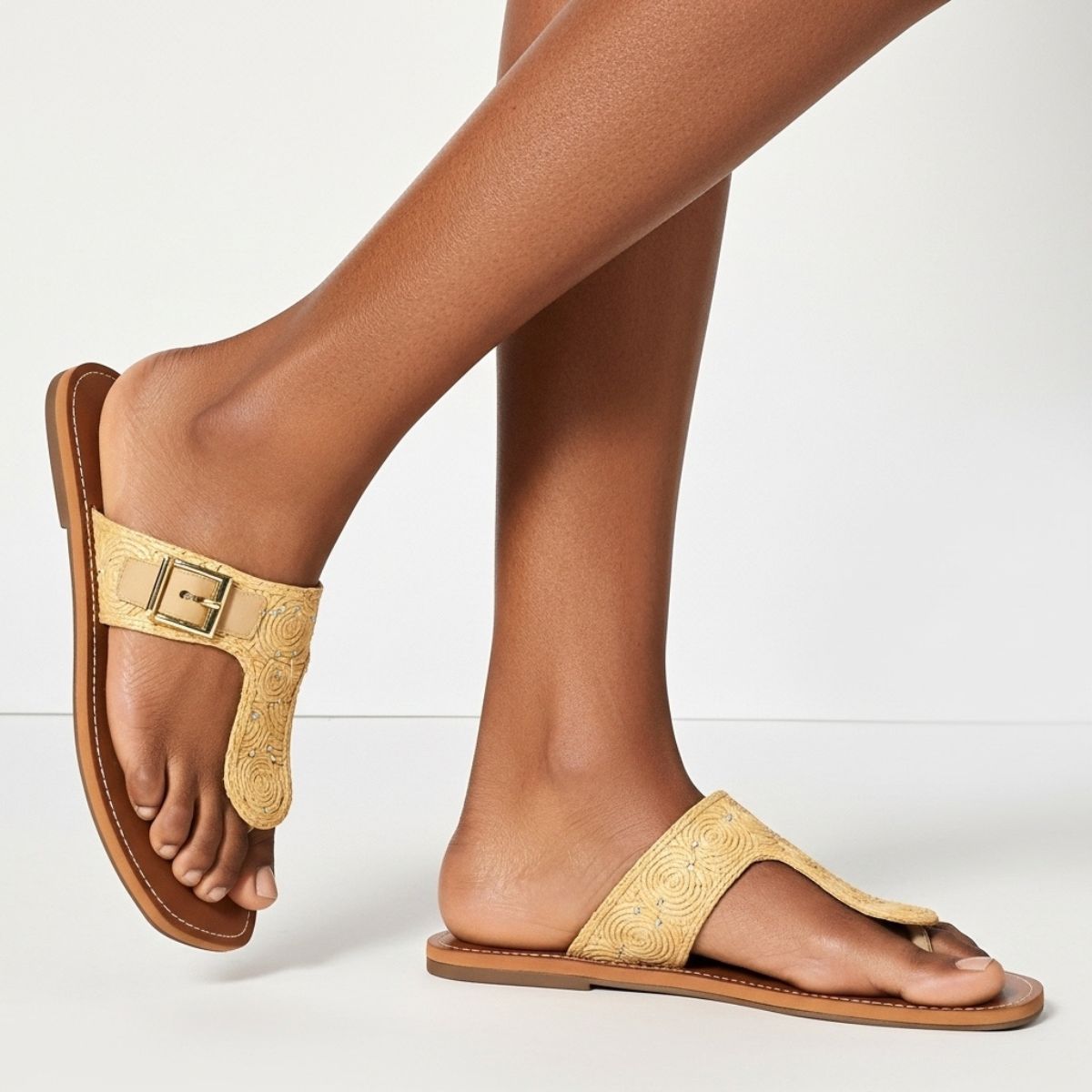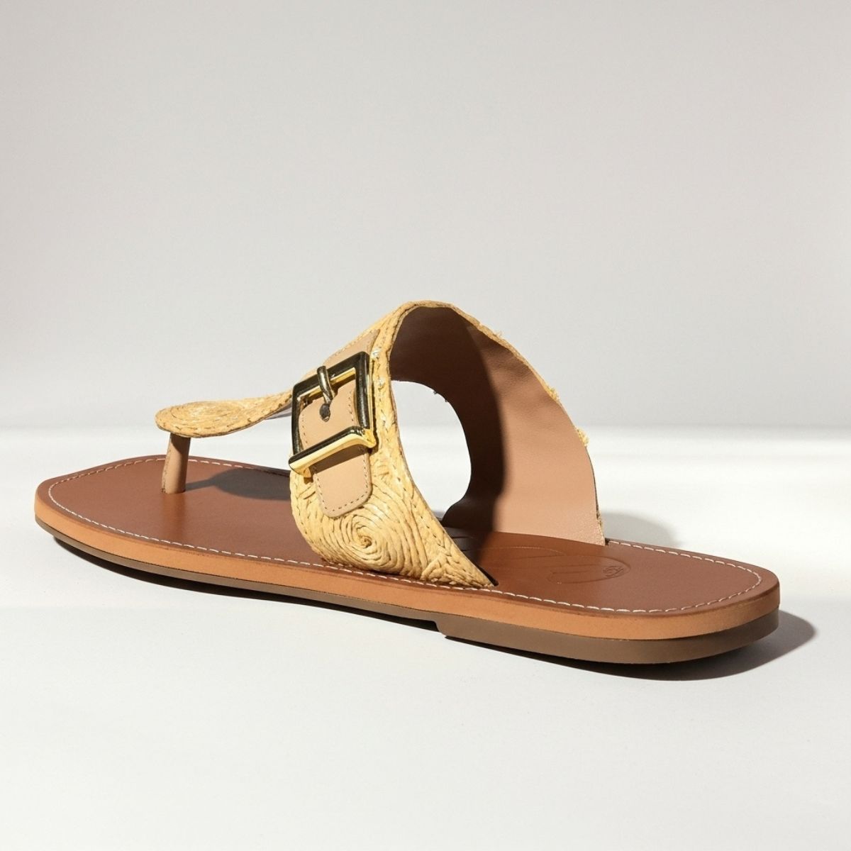 •  Sandália Rasteira Feminina de Dedo Bege com Textura de Trama Natural e Fivela Dourada