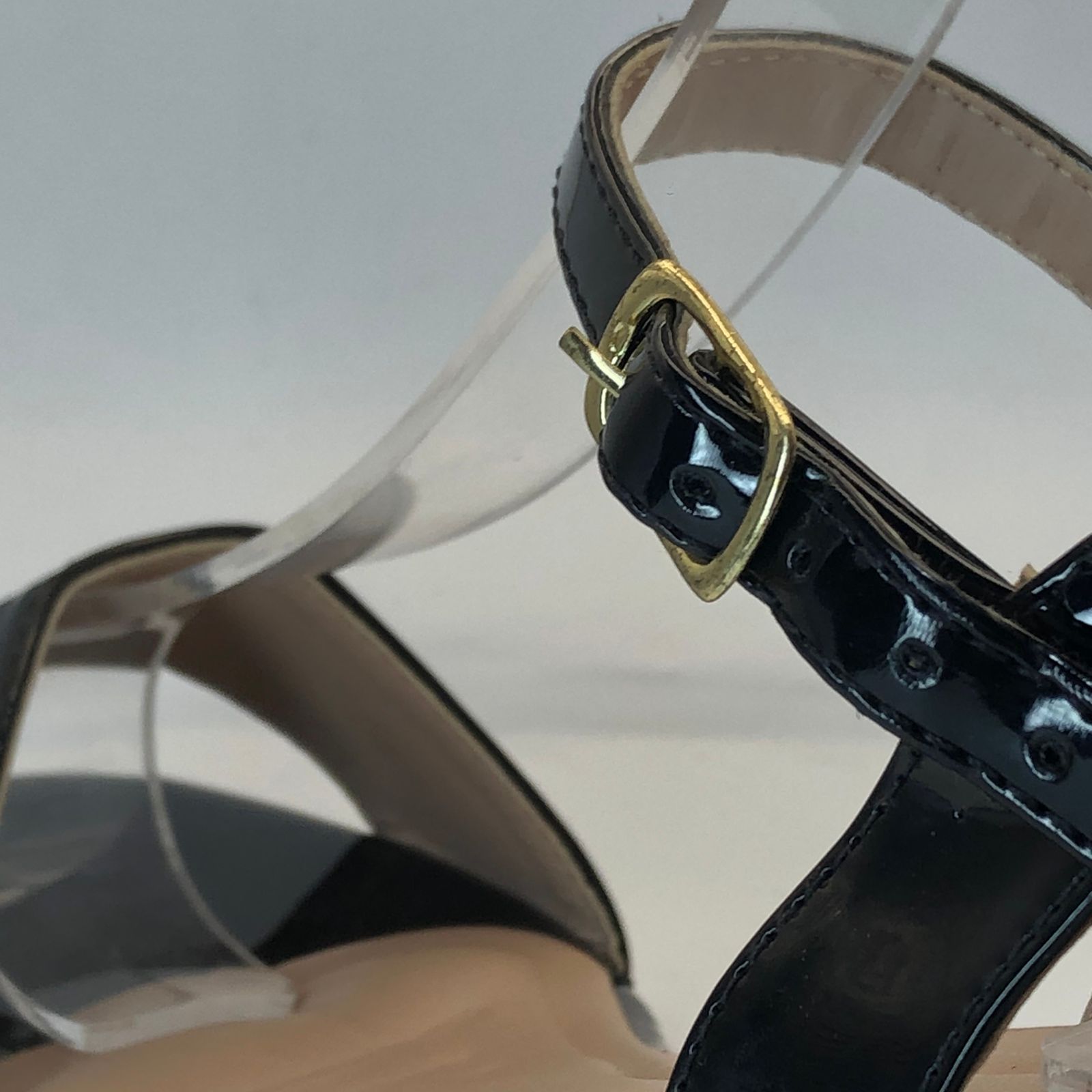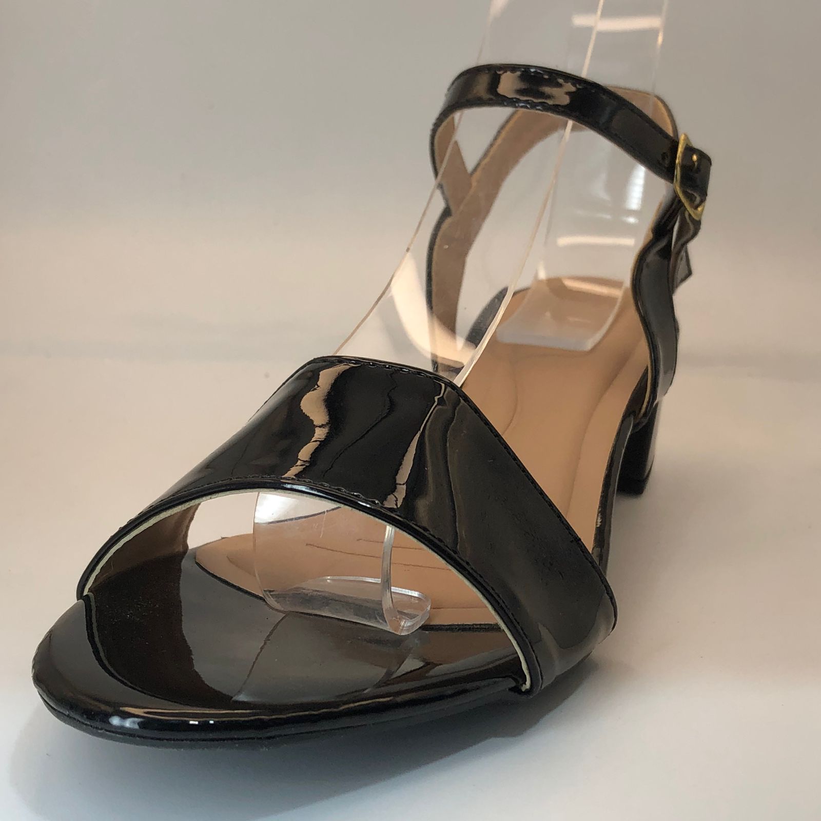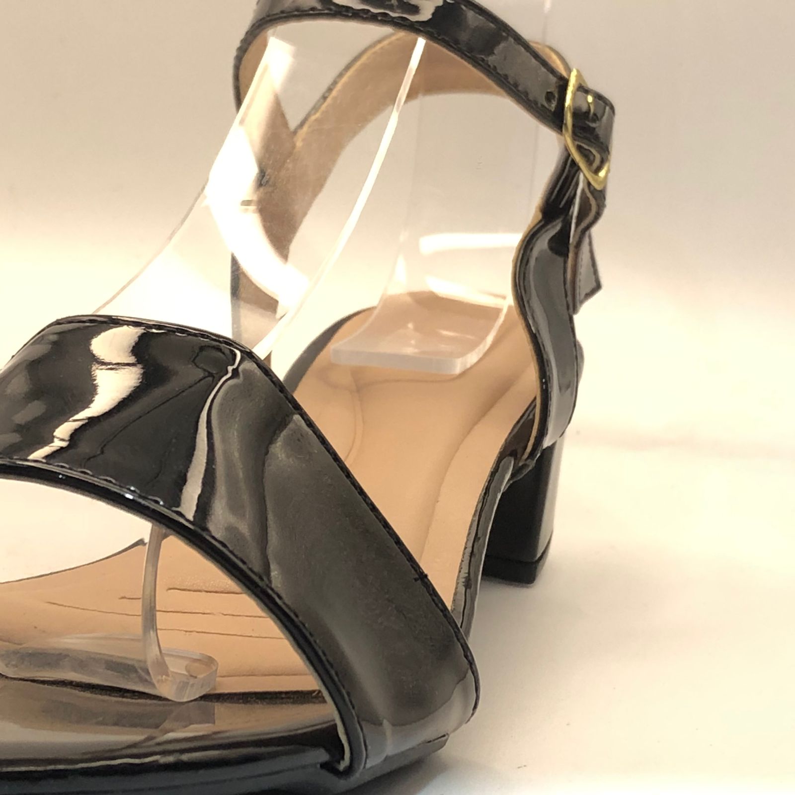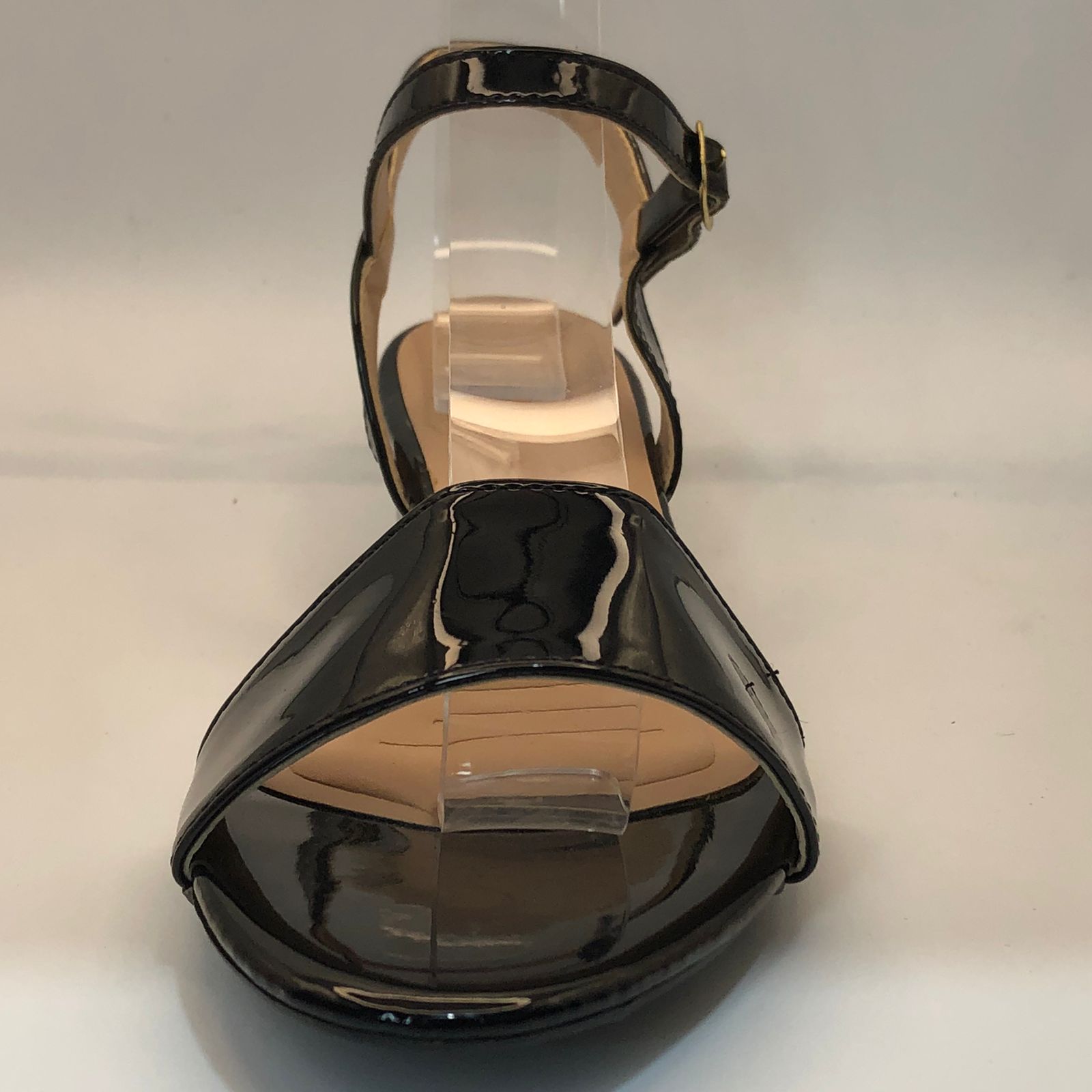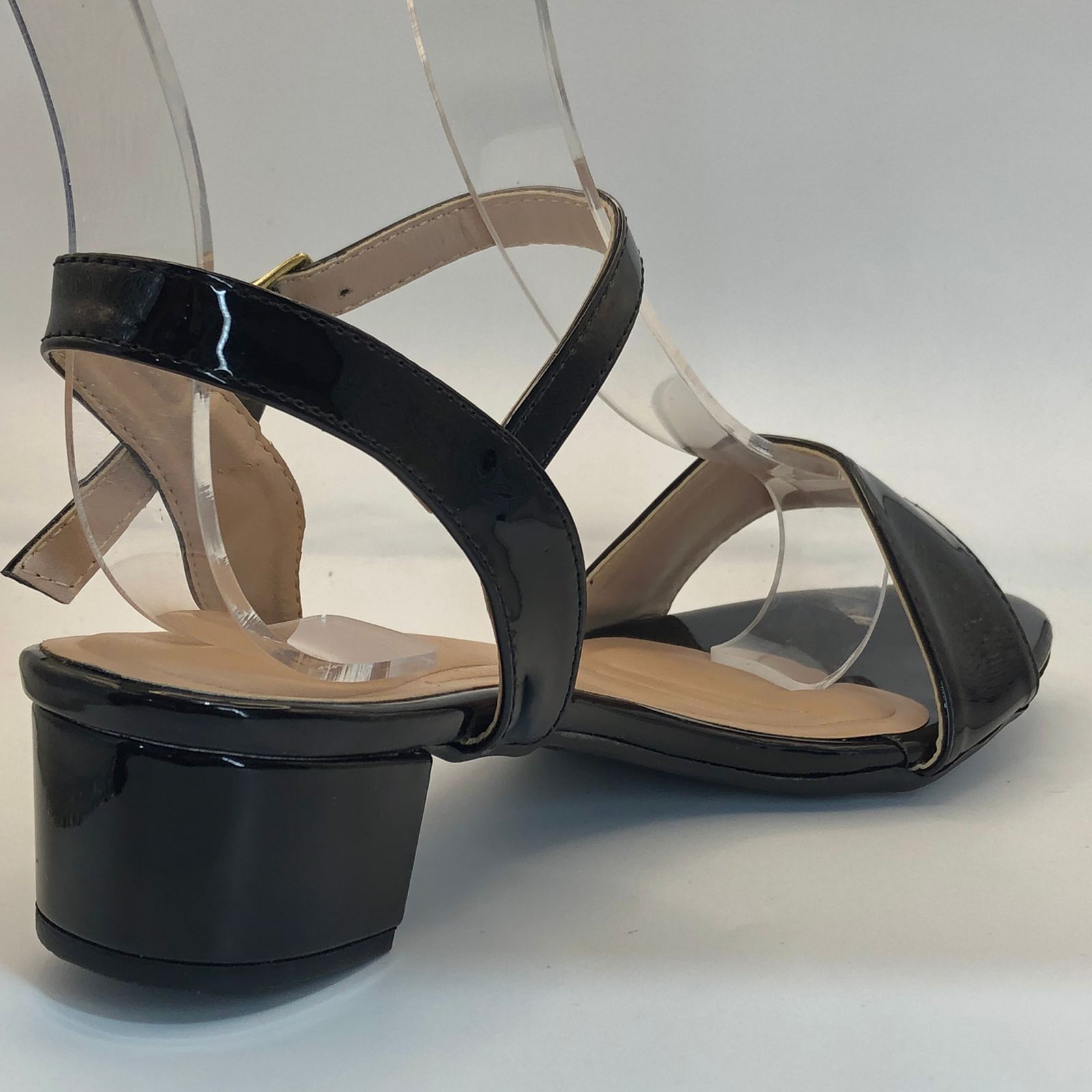 Modelo: Sandália de Salto Baixo / Salto Grosso. Cor: Preto (Acabamento em Verniz brilhante). Material (Cabedal): Material sintético com acabamento envernizado de alta qualidade e fácil limpeza.