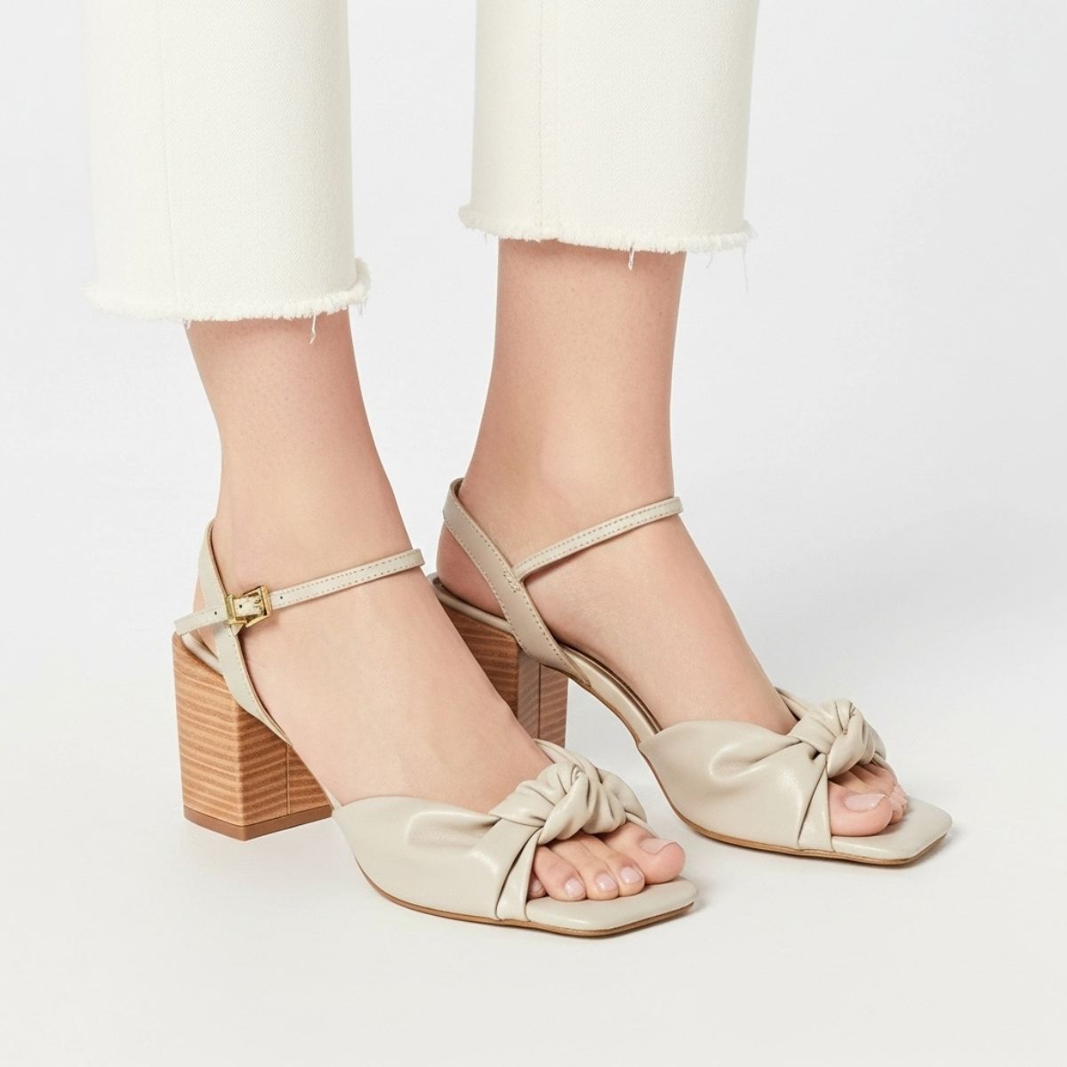 Nó Frontal: O destaque do modelo é a tira larga sobre os dedos com um nó central volumoso, conferindo um visual romântico e moderno ao mesmo tempo.