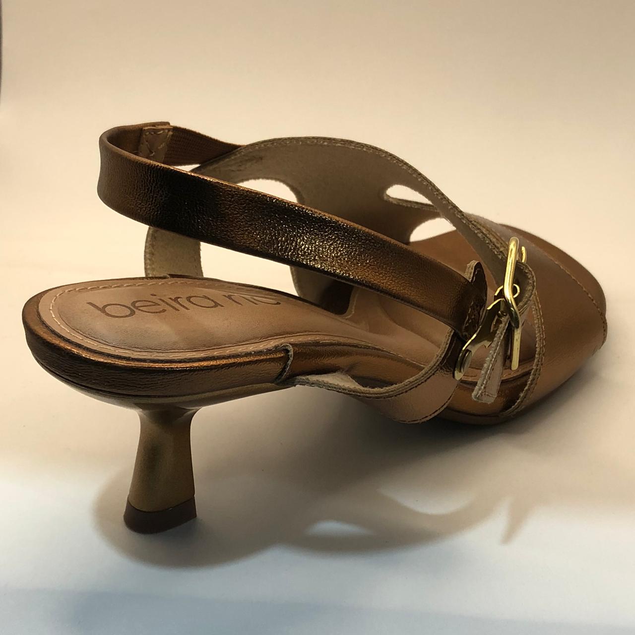 • Fechamento: Tira traseira com fivela metálica dourada para ajuste. Possui um pequeno elástico na lateral da tira, garantindo que ela não aperte e acompanhe o movimento do pé ao caminhar.