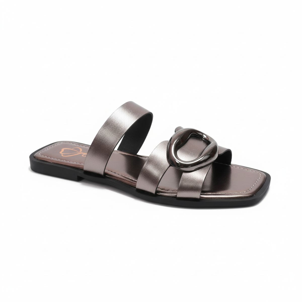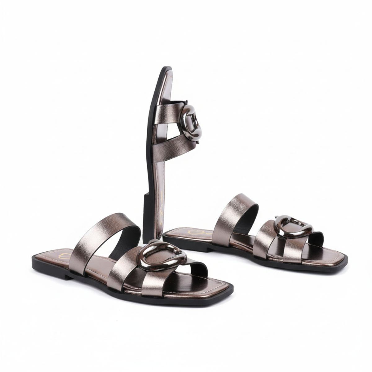 Esta sandália rasteira combina a tendência metalizada com um design robusto e minimalista, resultando em um calçado moderno e extremamente versátil para o seu dia a dia.
