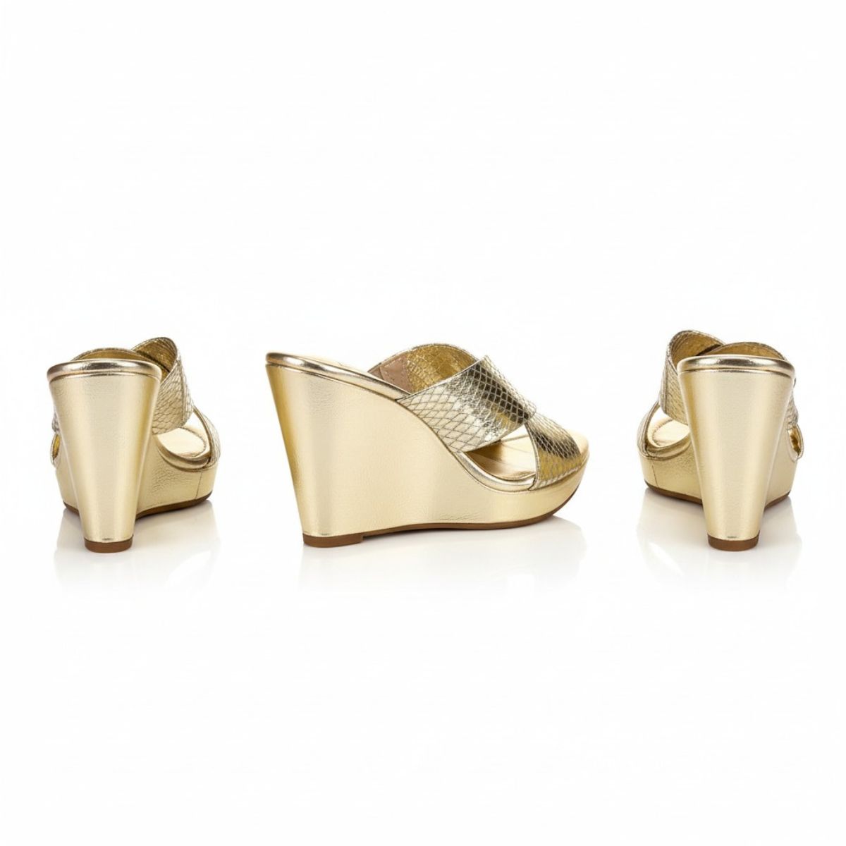 Sandália Tamanco Anabela Moleca Dourado com Tiras Cruzadas Texturizadas