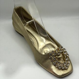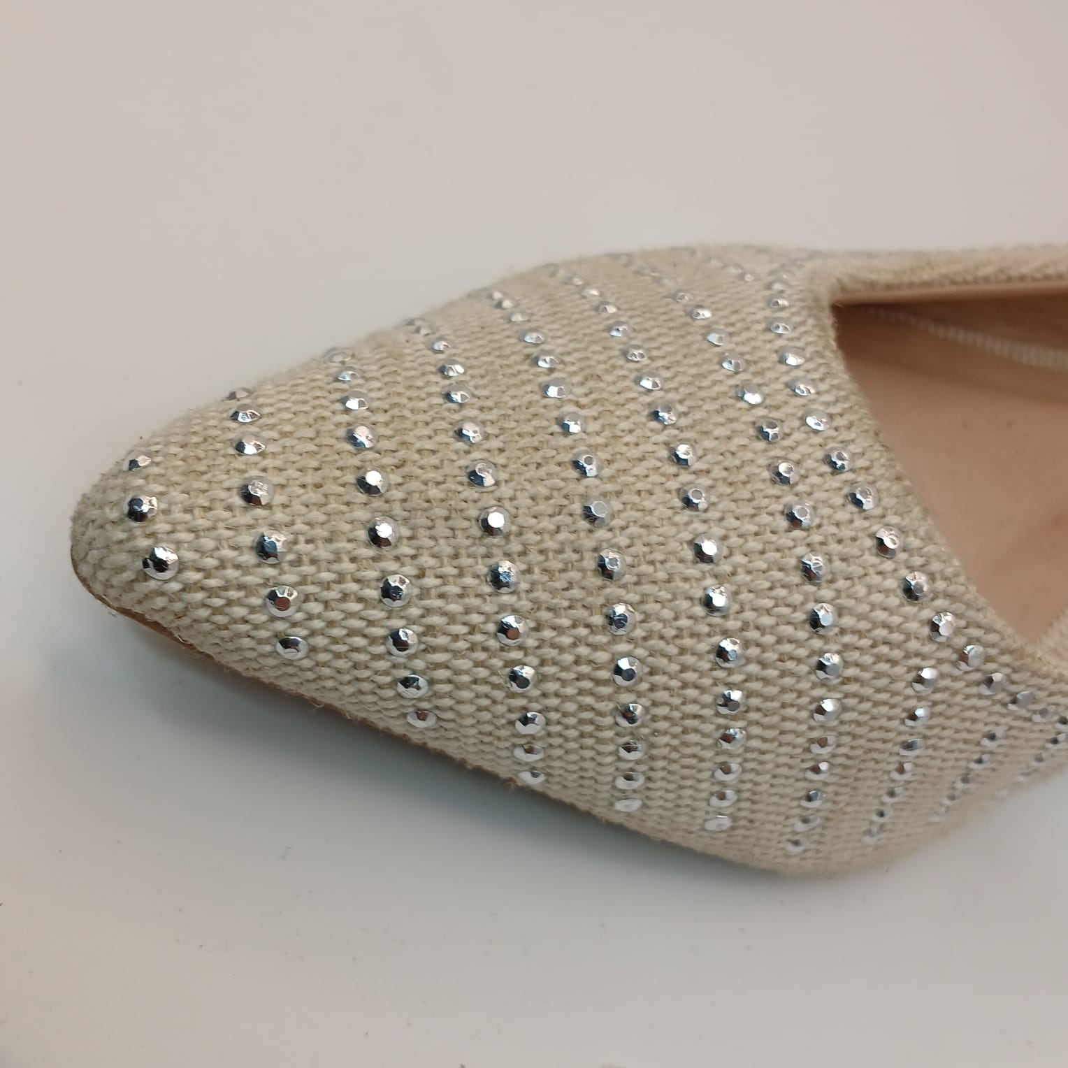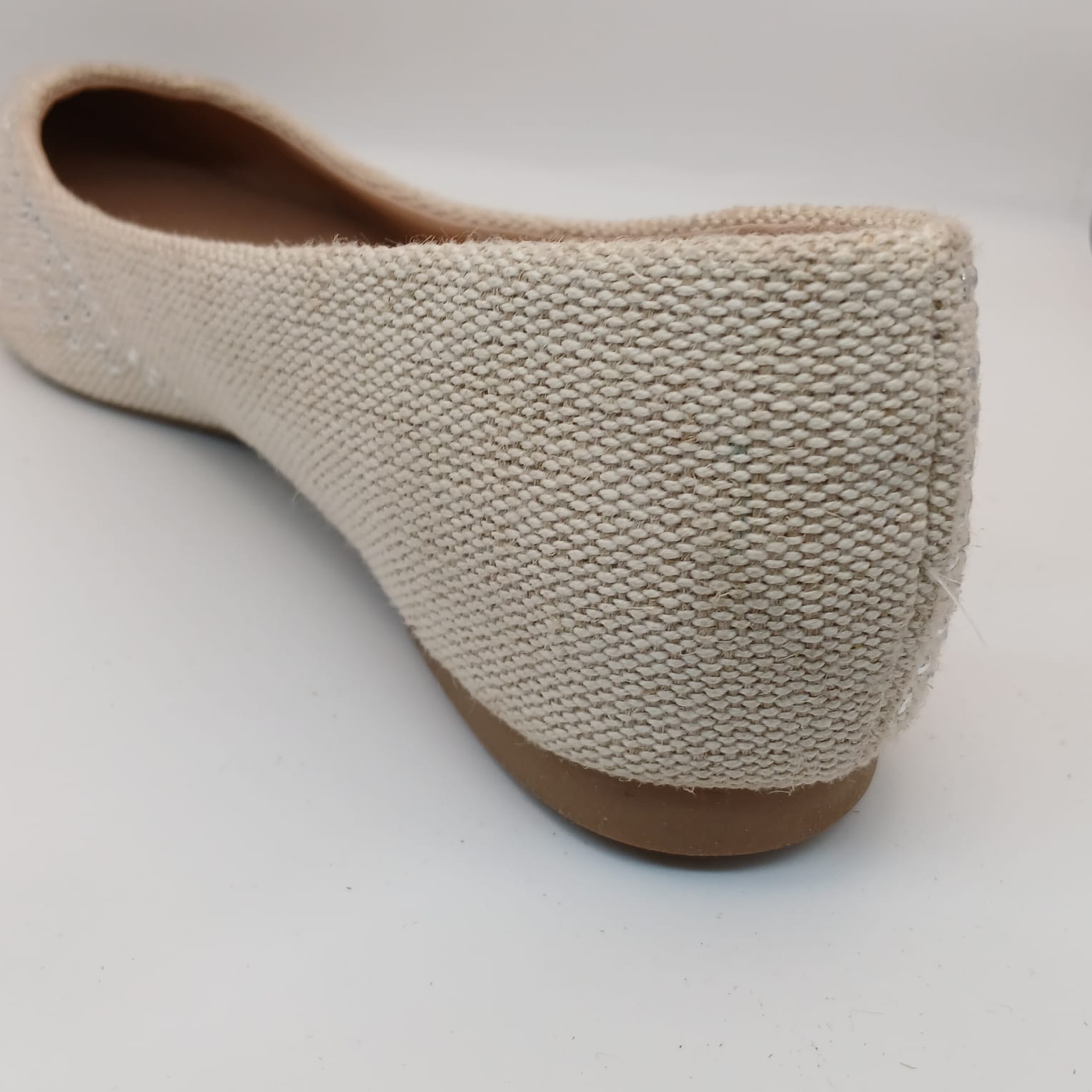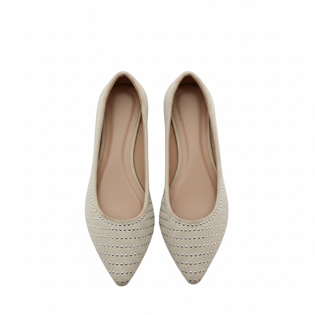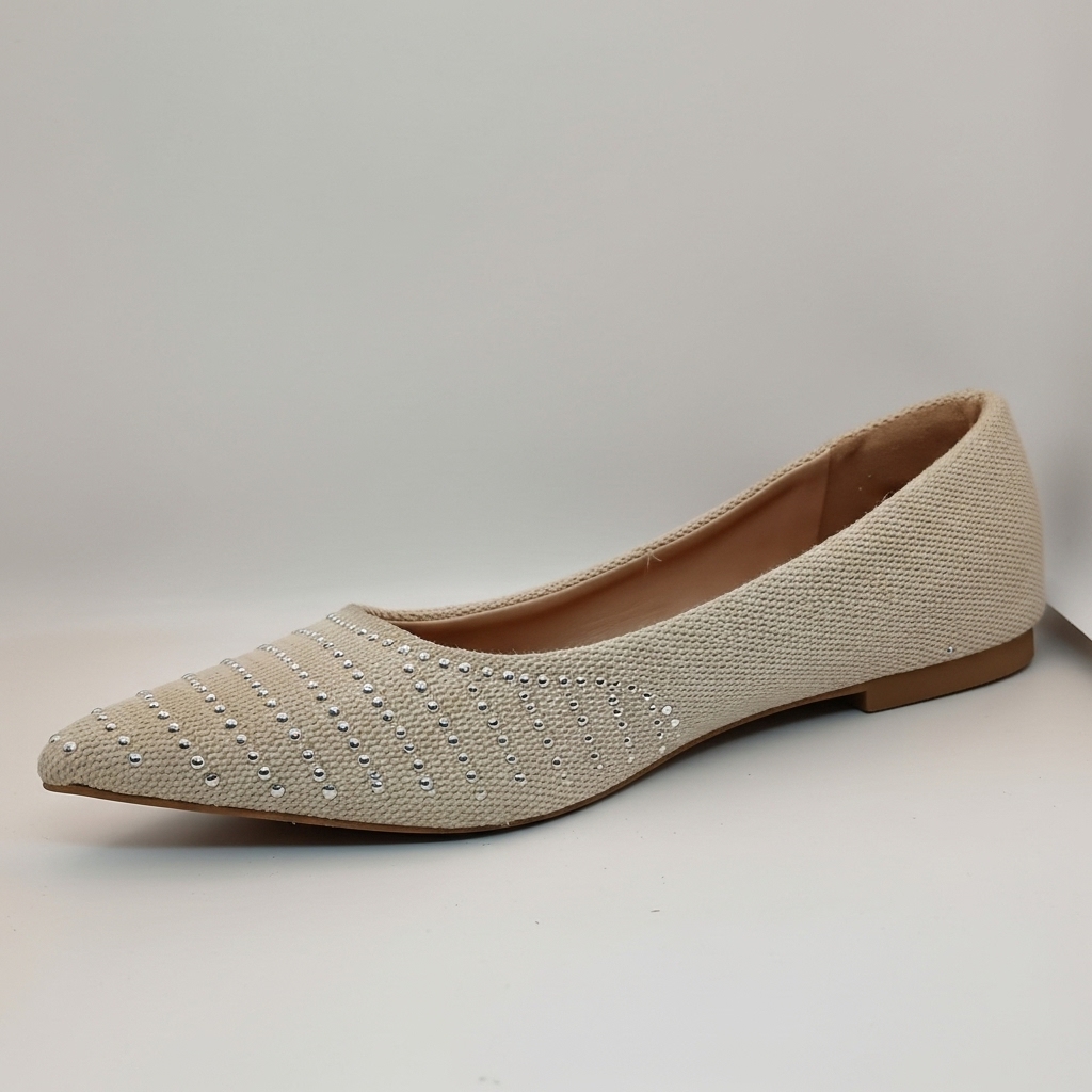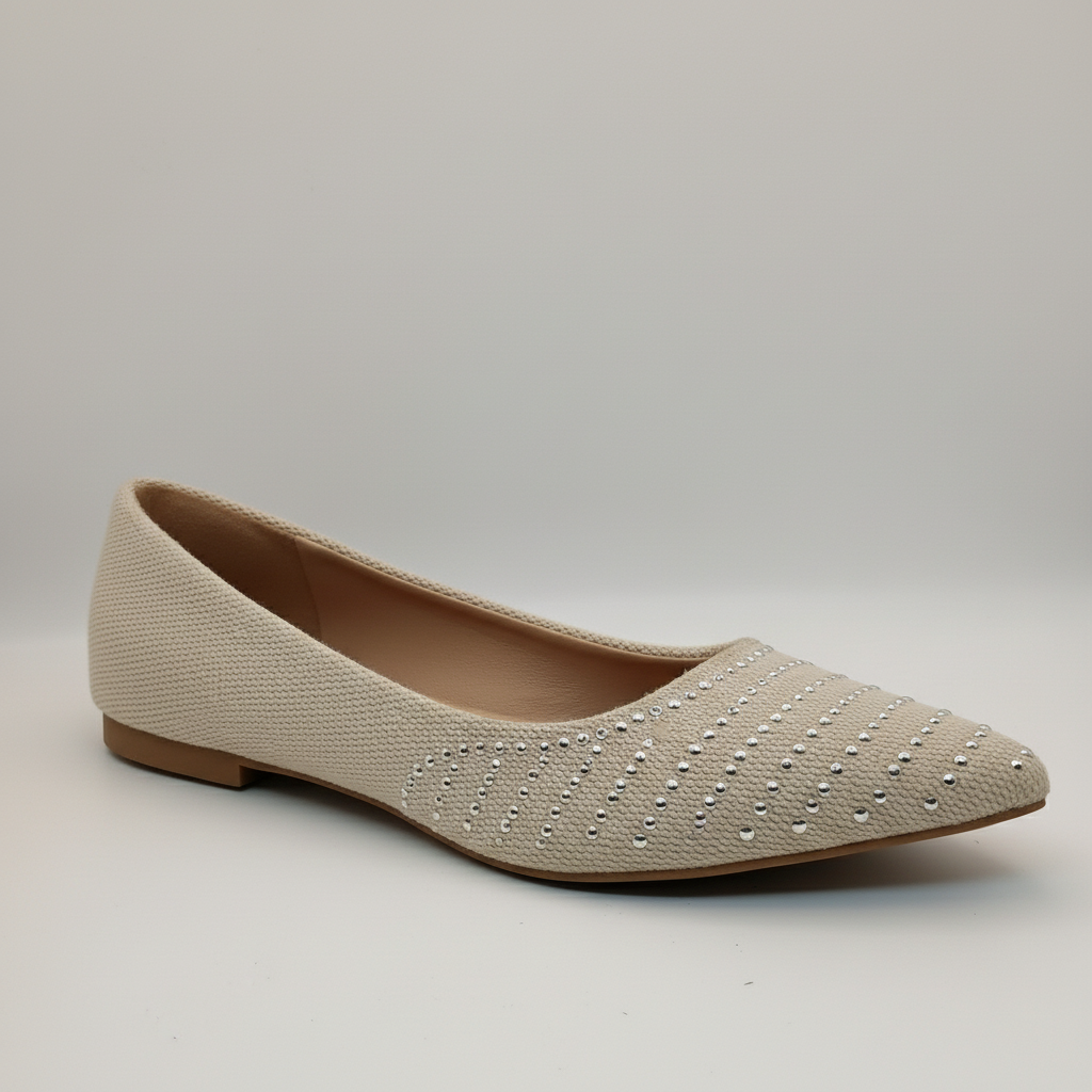 A sapatilha perfeita para quem busca o equilíbrio entre o chique e o casual. Este modelo de *bico fino* combina a elegância clássica com a leveza de um material texturizado, em um tom *bege (ou cru)* que é a definição de versatilidade.