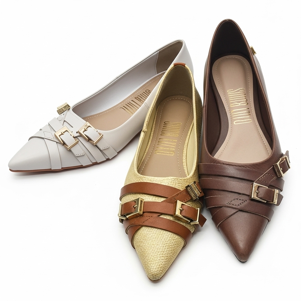 O grande diferencial deste modelo é o seu cabedal, que apresenta um *design de tiras sobrepostas e cruzadas. Este detalhe é finalizado com **duas mini fivelas retangulares em metal dourado*, que funcionam como um adorno sofisticado, adicionando pontos de luz e um toque “utility chic” ao sapato.