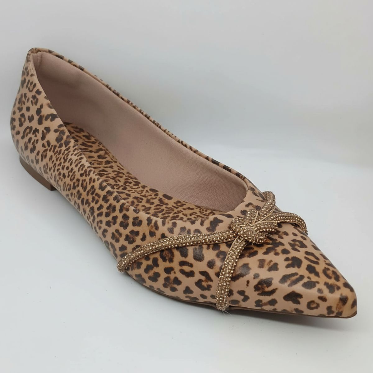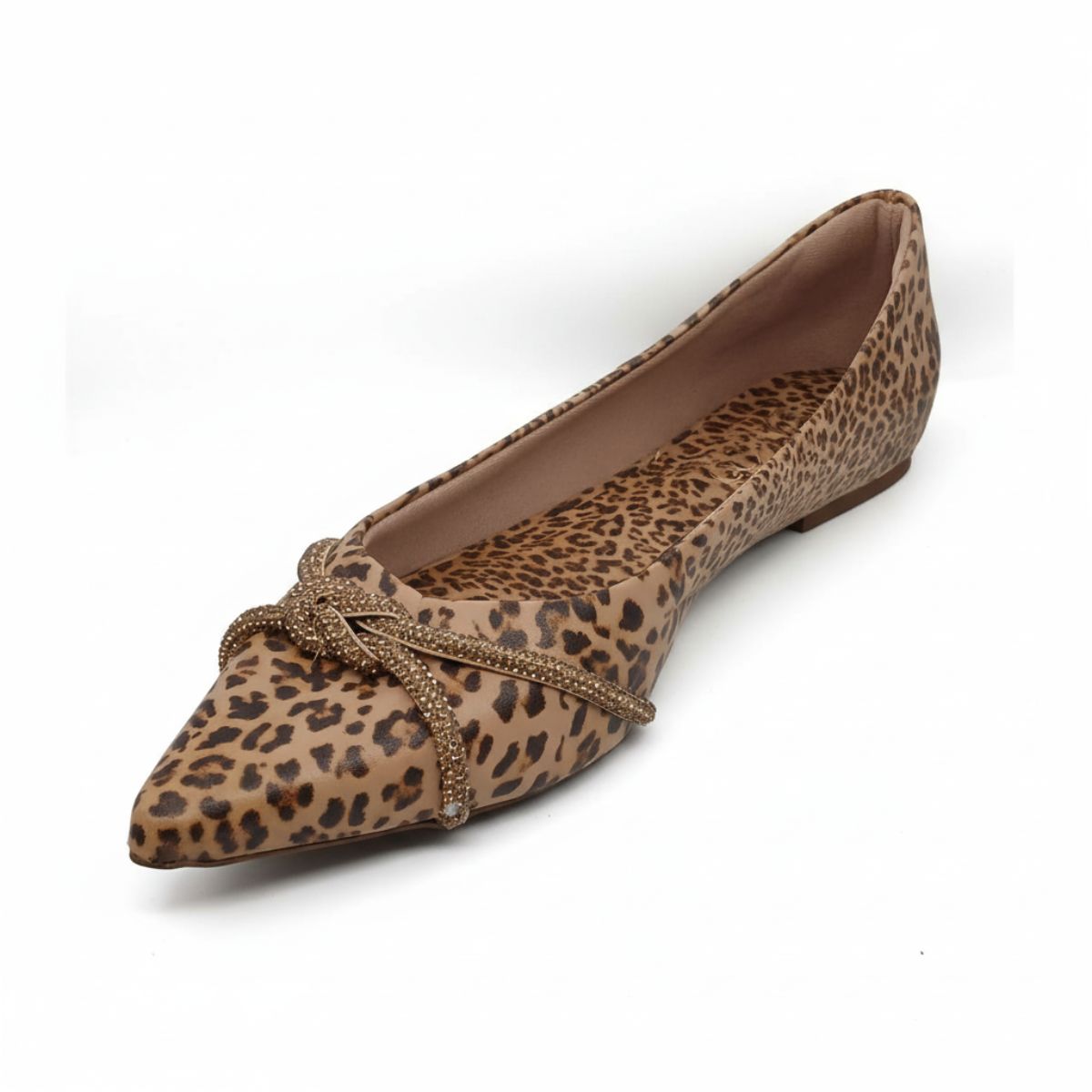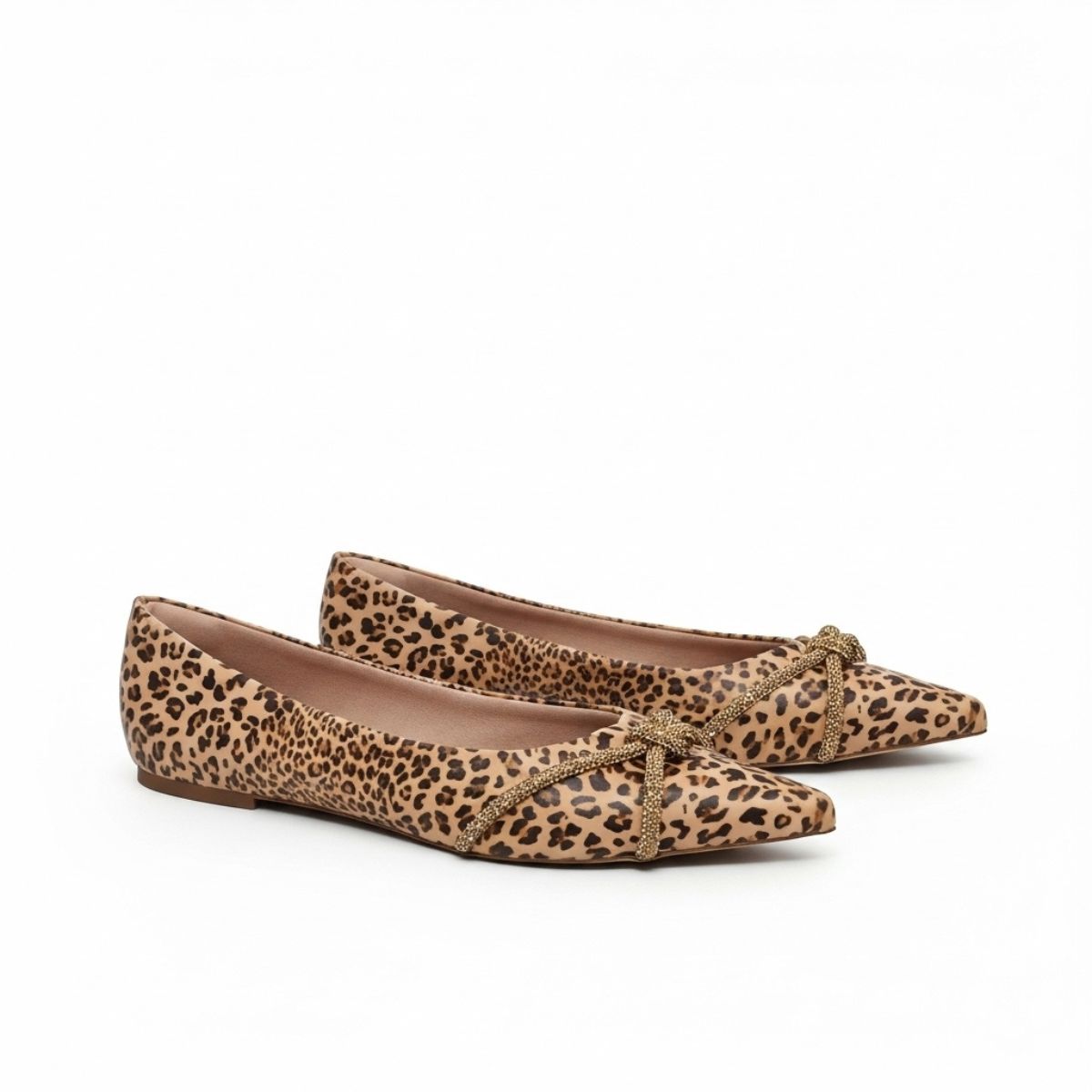 Para quem ama um clássico com um toque de glamour, esta sapatilha de bico fino é a escolha perfeita. Ela une a força atemporal da estampa de *animal print (leopard)* com a sofisticação de um detalhe brilhante, criando um calçado que transita facilmente do casual ao chique.