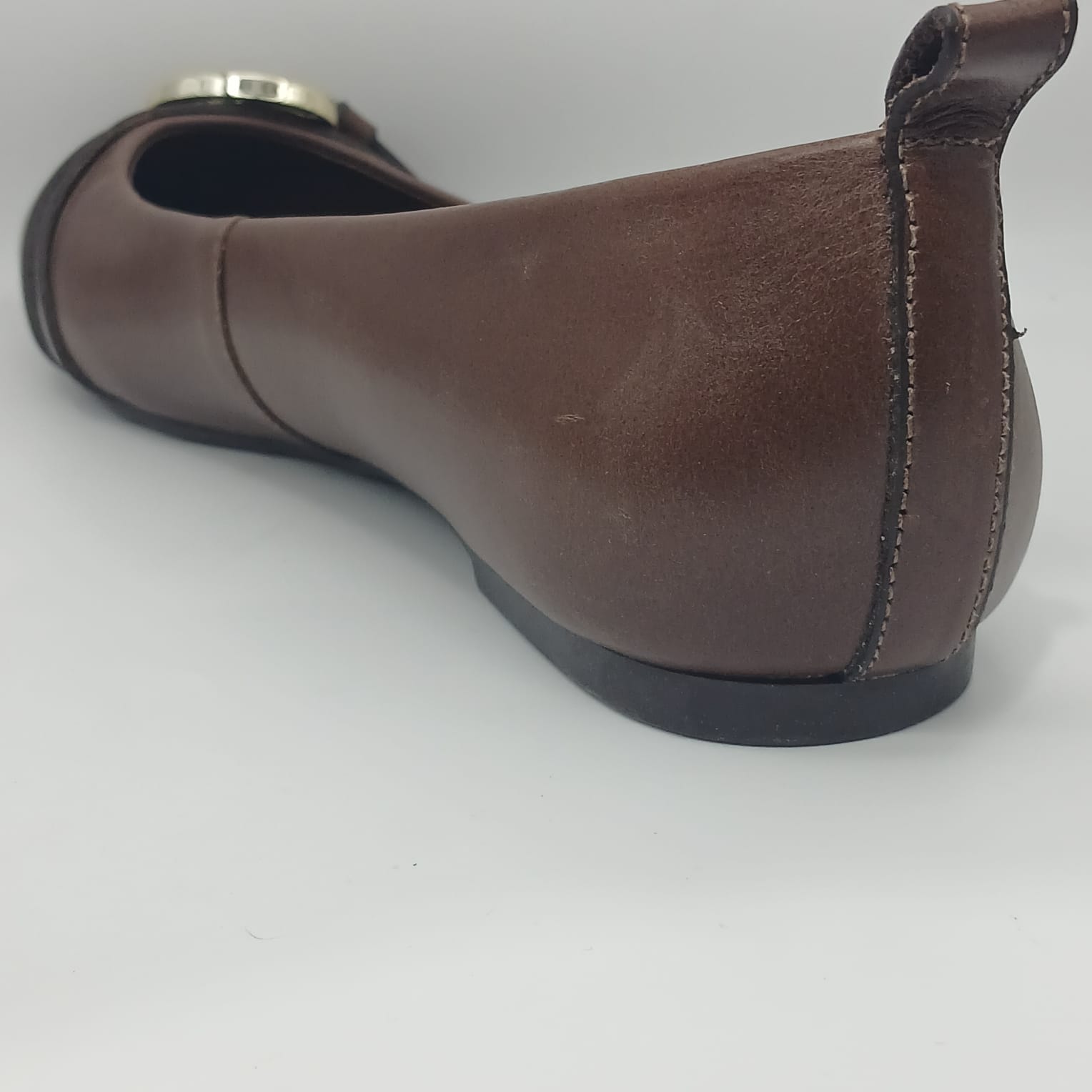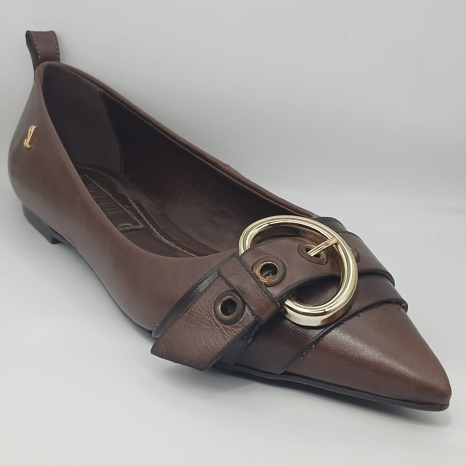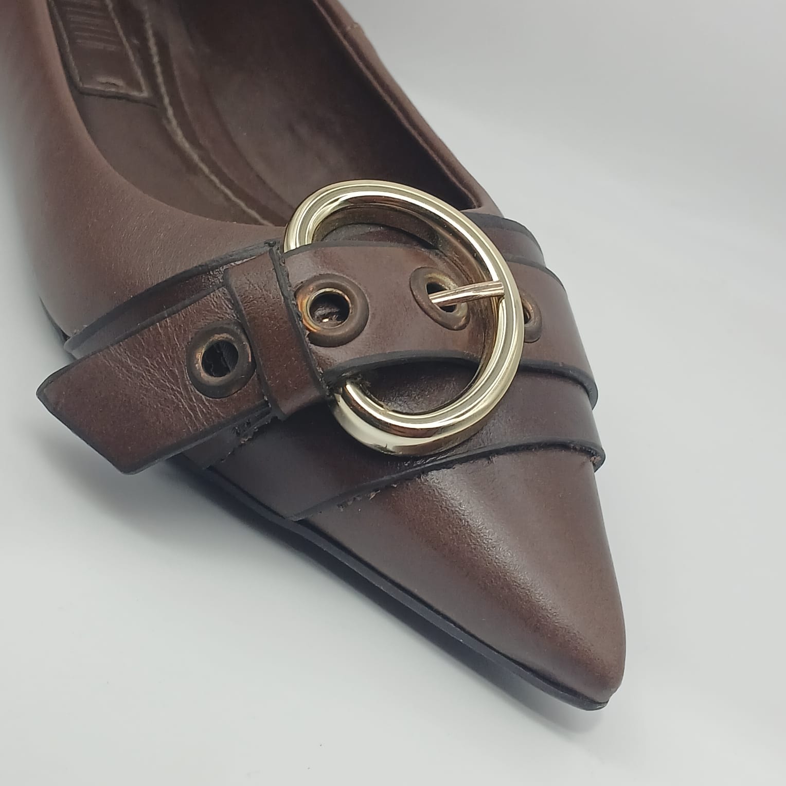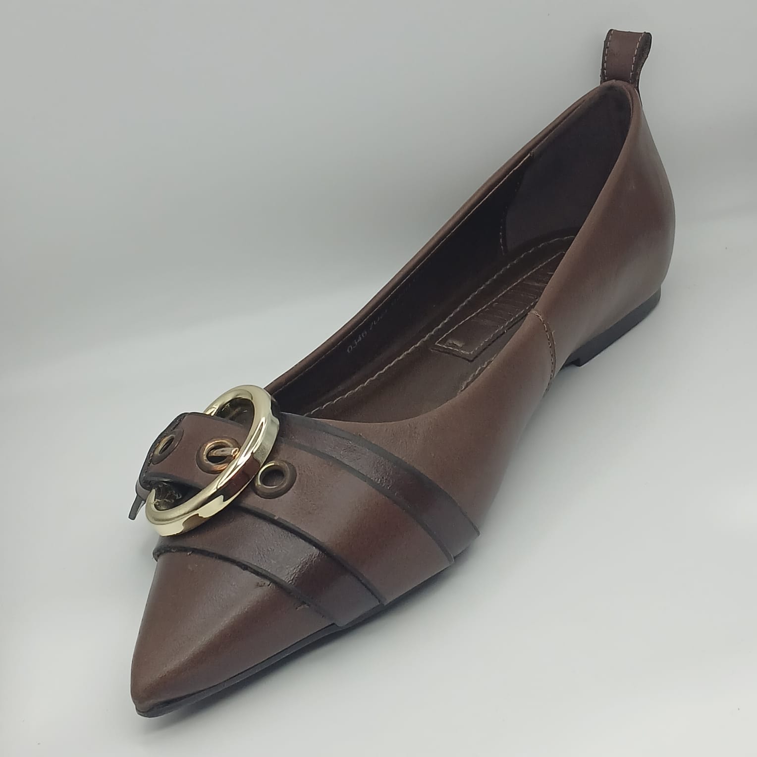 O design de *bico fino* alonga a silhueta, conferindo um ar poderoso e refinado. O grande protagonista é o adorno no cabedal: um design robusto que mistura *tiras sobrepostas* com uma *maxi fivela redonda em metal dourado. Detalhes como os **ilhoses metálicos* (em tom de ouro-velho/bronze) adicionam uma personalidade extra, lembrando um estilo “utility chic”.
