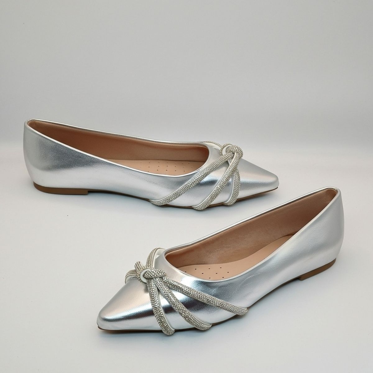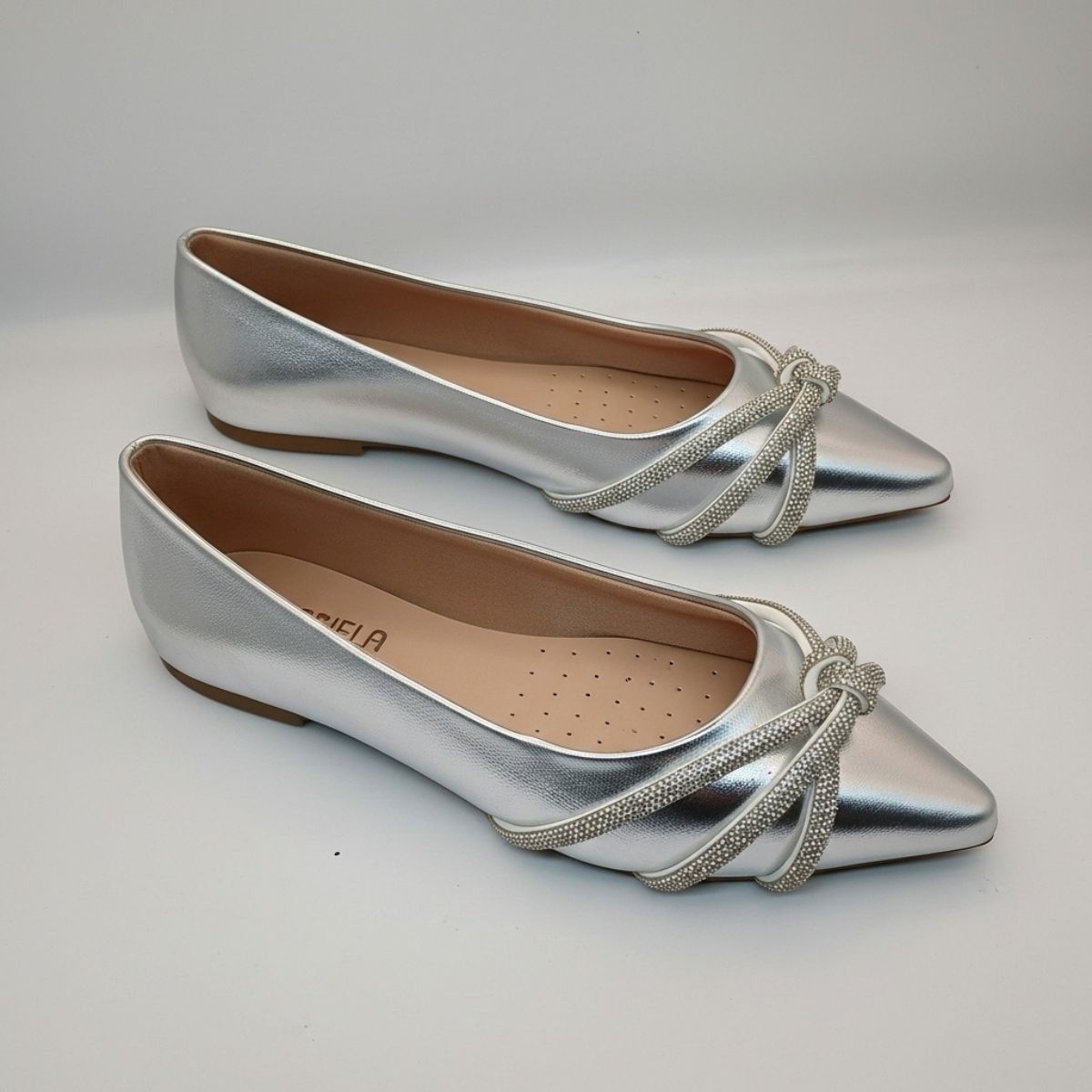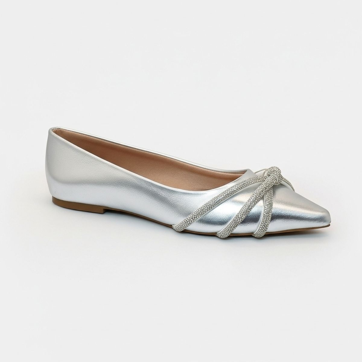 O design se destaca pelo bico fino, que confere um ar mais alongado e refinado, e pelo espetacular detalhe no cabedal: um laço estilizado formado por tiras cravejadas de strass, que capturam a luz a cada passo. O acabamento metalizado por todo o sapato garante um look moderno e glamouroso.