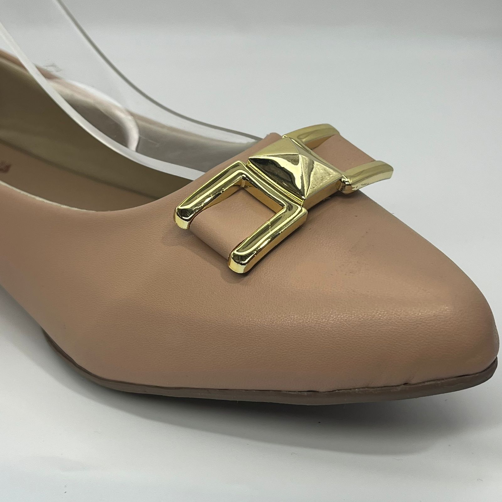 O charme principal fica por conta do *adorno geométrico em metal dourado* aplicado no cabedal. Este detalhe, que lembra um laço ou fivela estilizada, adiciona um ponto de luz moderno e luxuoso, quebrando a simplicidade do sapato com muito bom gosto.