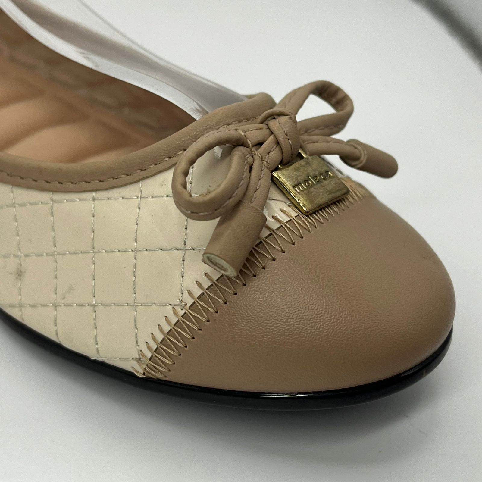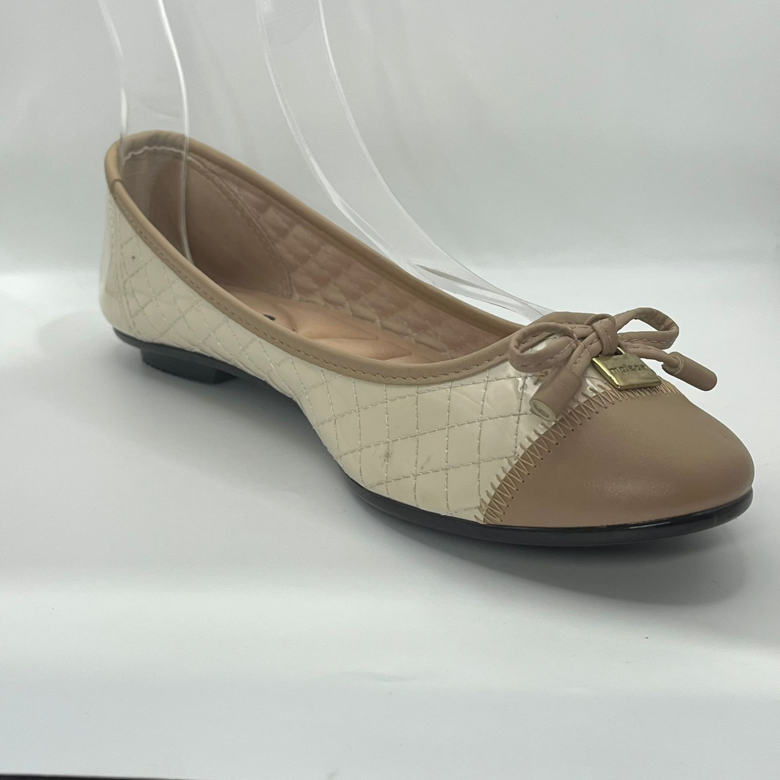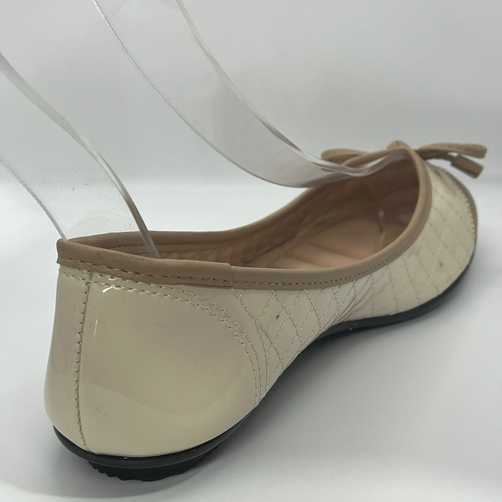 O design se destaca pela sua *textura em matelassê* (costuras em losango) no corpo do calçado, que possui um sofisticado *acabamento em verniz* na cor off-white (creme).