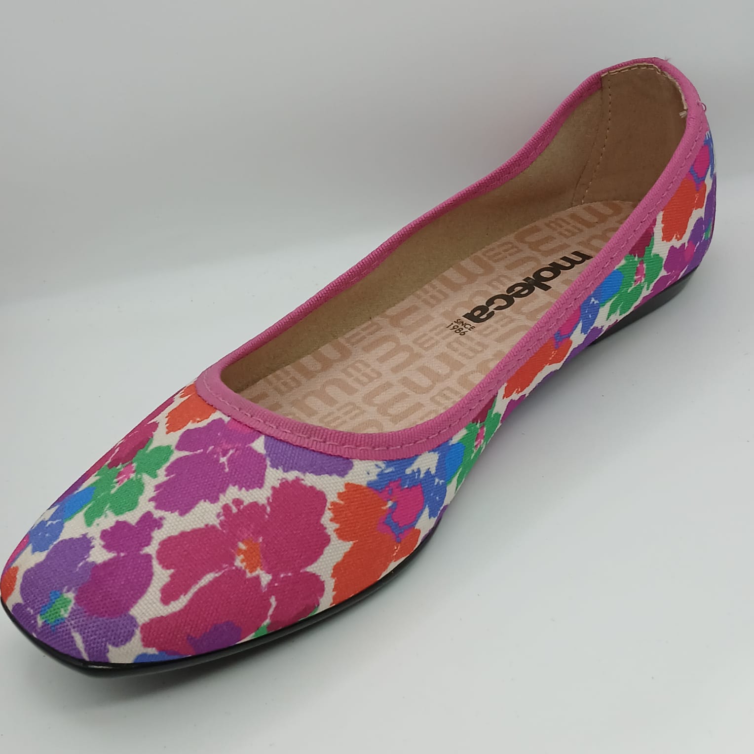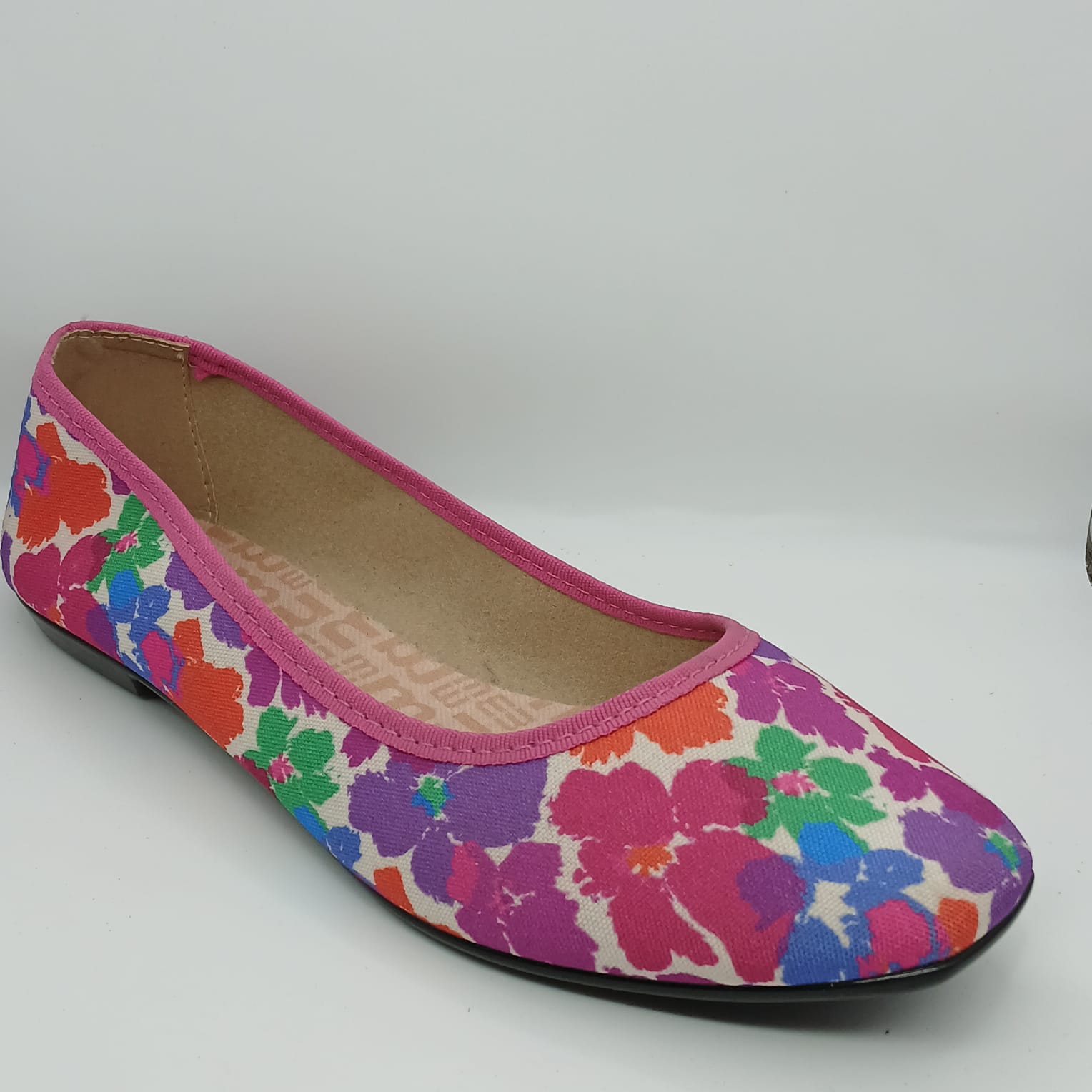 O grande destaque é a sua *estampa maxi floral* em cores vibrantes, misturando tons de *pink, roxo, laranja, azul e verde* sobre um fundo claro. O design clássico de *bico redondo* e o acabamento do *debrum em tecido rosa pink* dão um charme extra e um acabamento delicado.