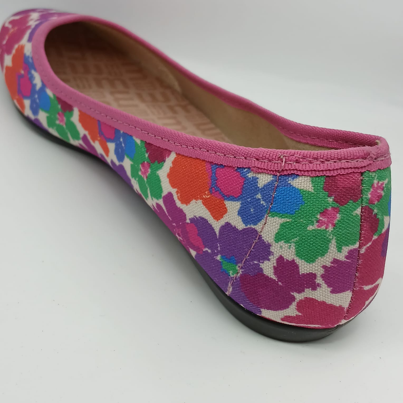 * *Detalhe:* Acabamento em *debrum (borda) rosa pink*, que contorna a sapatilha e complementa a estampa.