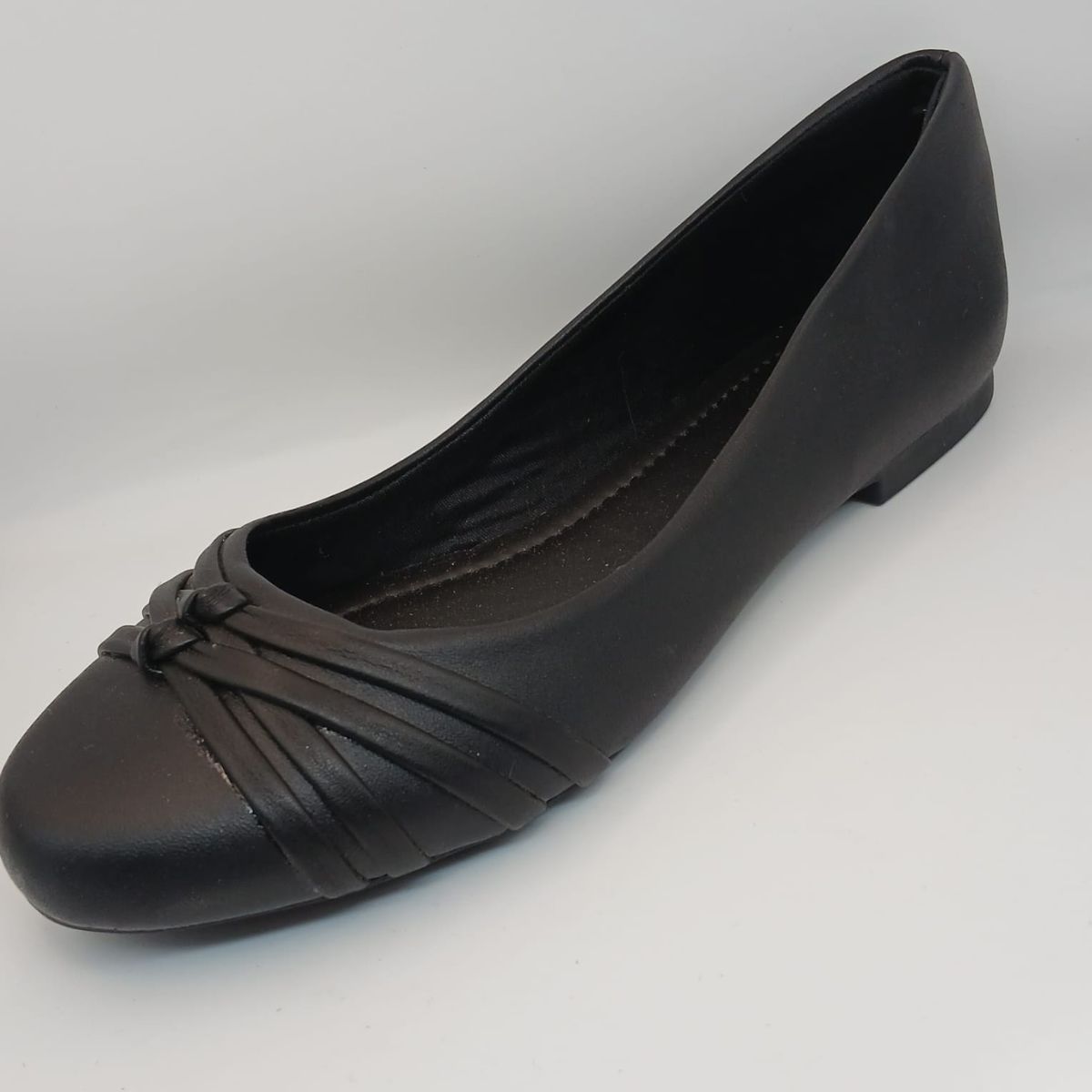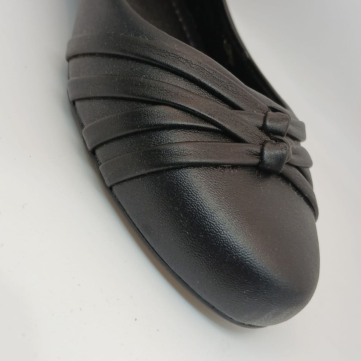 O design sofisticado se destaca pelo charmoso detalhe no cabedal: um drapeado delicado que se encontra em um nó central, adicionando textura e um toque de refinamento ao visual. O bico redondo clássico e o acabamento liso em material sintético de alta qualidade garantem um ajuste suave e confortável aos pés.
