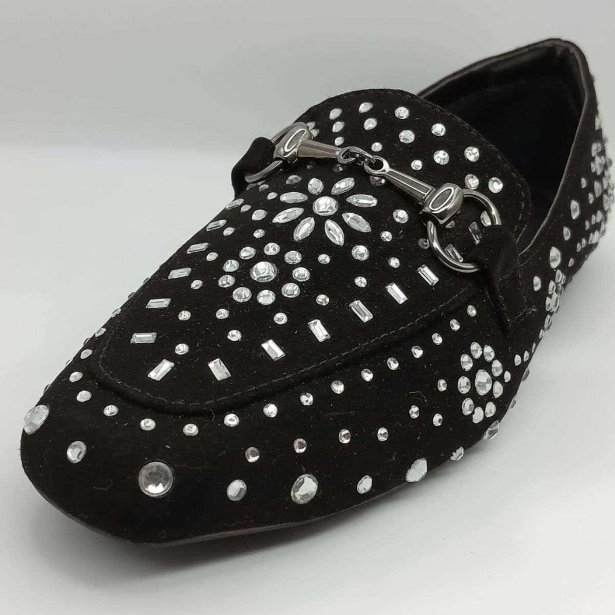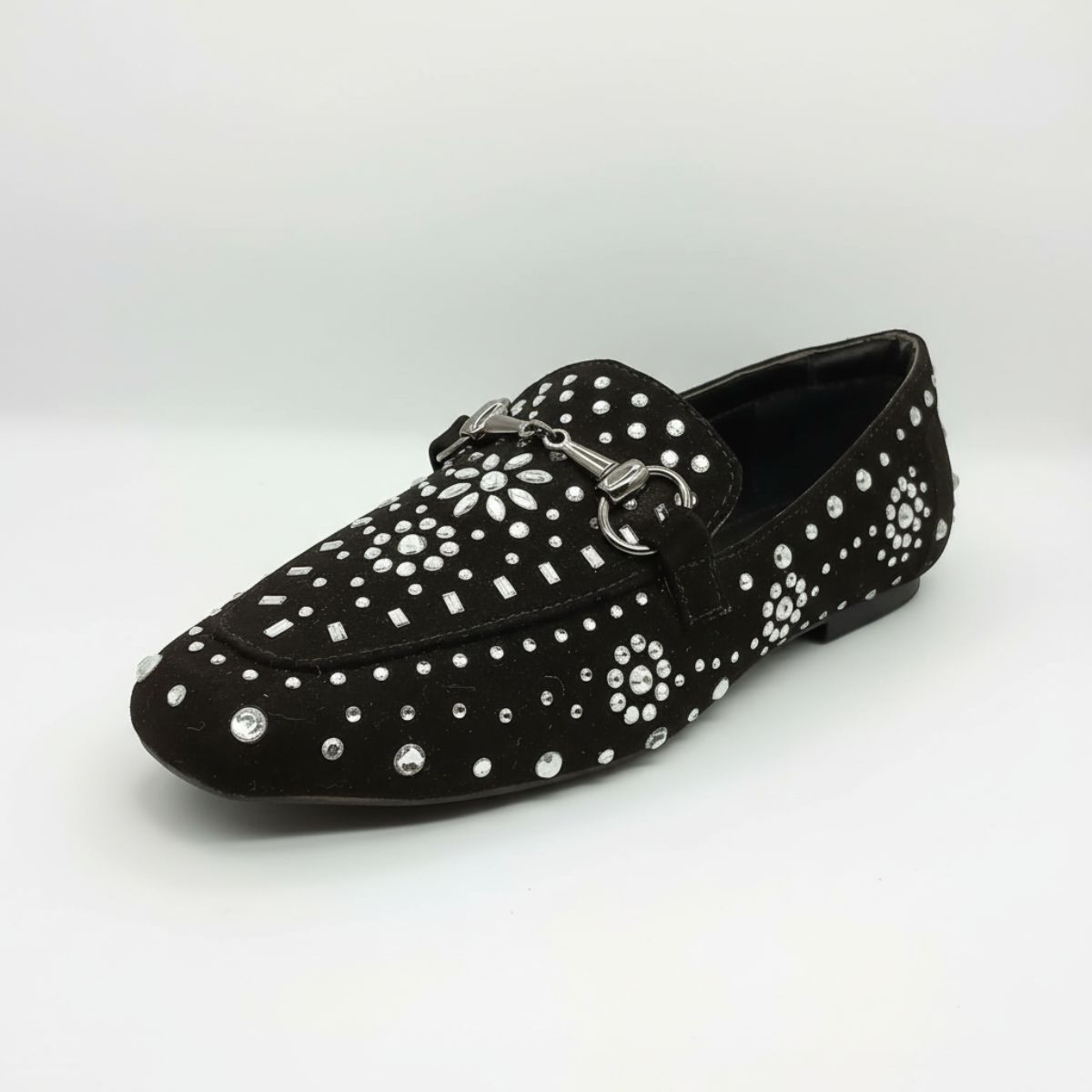 Prepare-se para brilhar com essa sapatilha que transforma o clássico em uma peça de puro glamour. Com um sofisticado acabamento acamurçado preto, este sapato é a tela perfeita para uma deslumbrante aplicação de pedrarias e strass em diversos formatos.