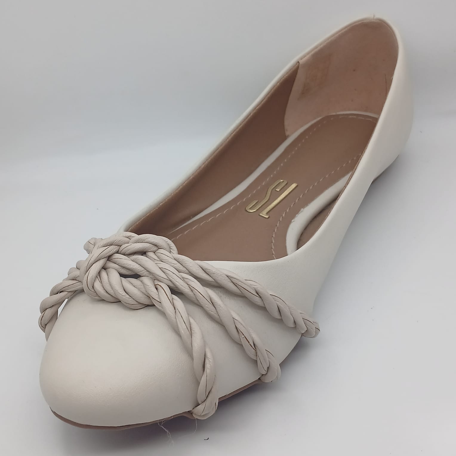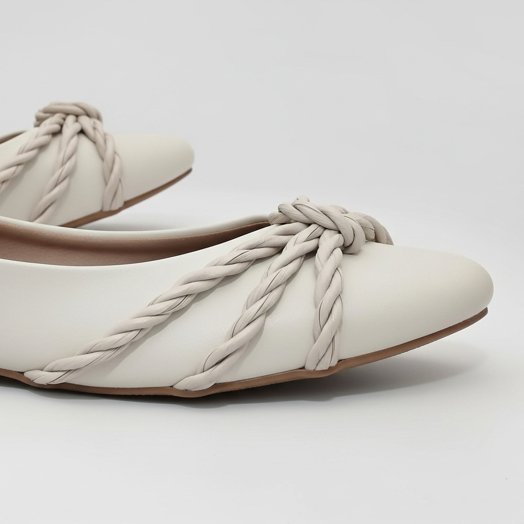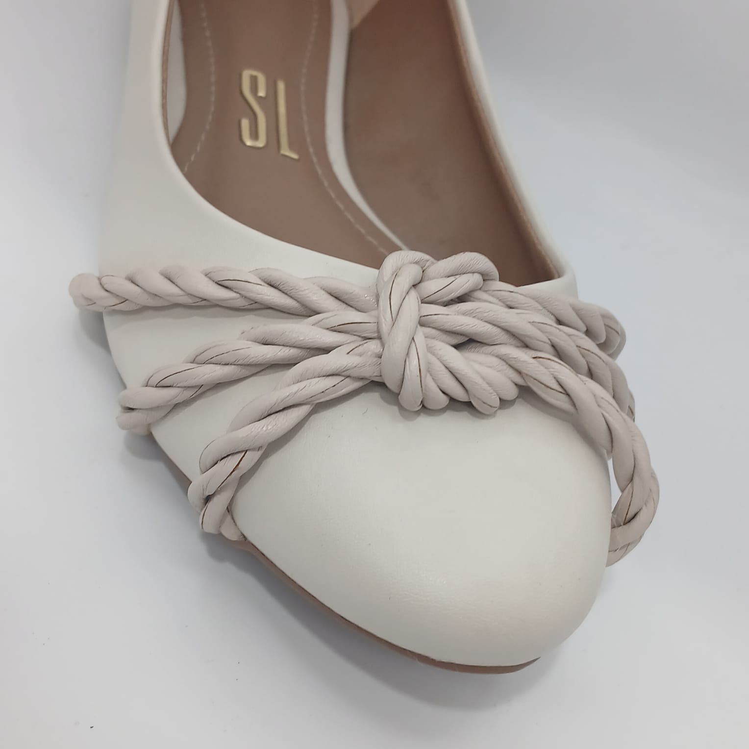 O design clássico de *bico redondo* é elevado por um adorno único: um *maxi nó* complexo e artesanal que cobre o peito do pé. Este detalhe é formado por múltiplos *cordões trançados e lisos* que se entrelaçam, criando uma textura rica e um visual náutico-chique.