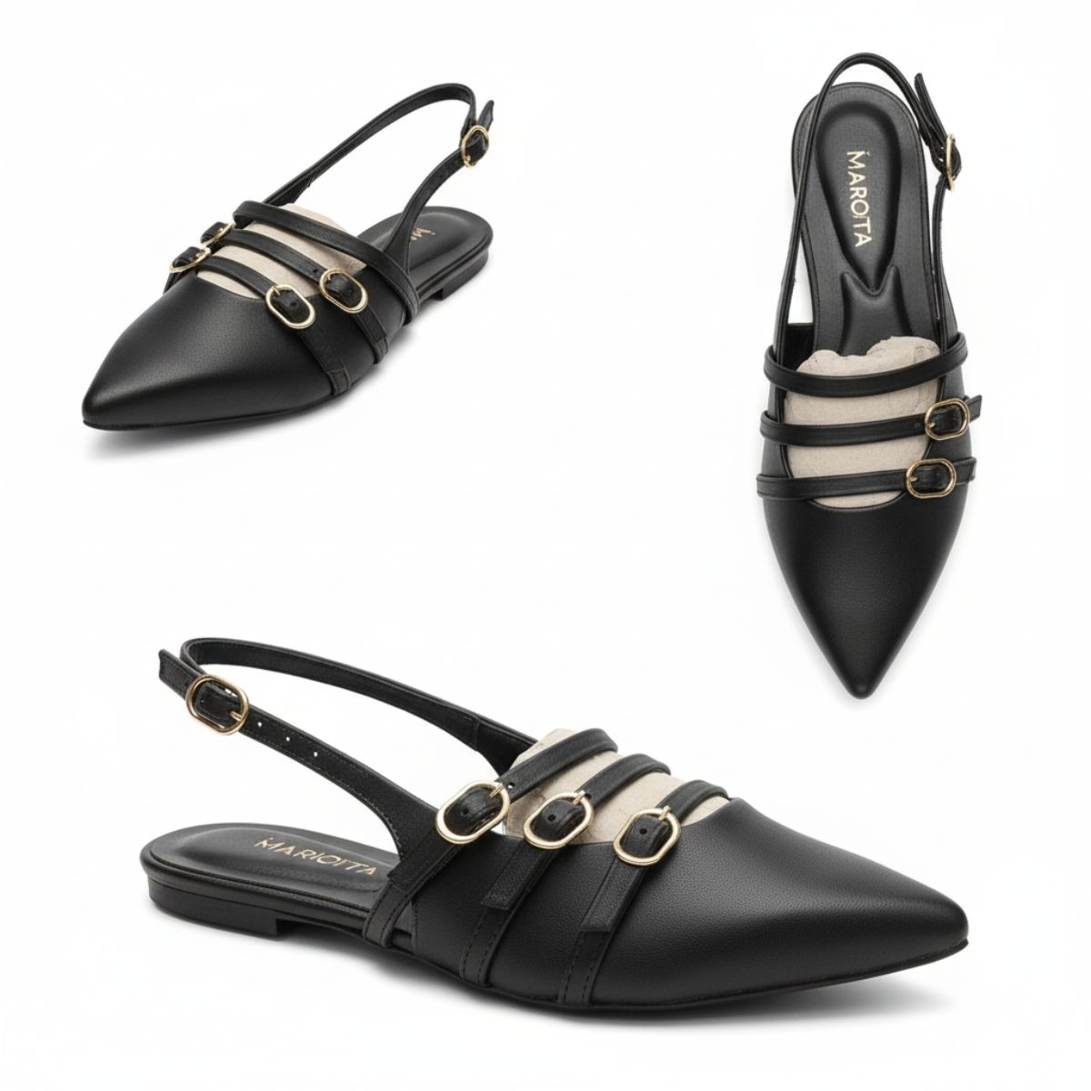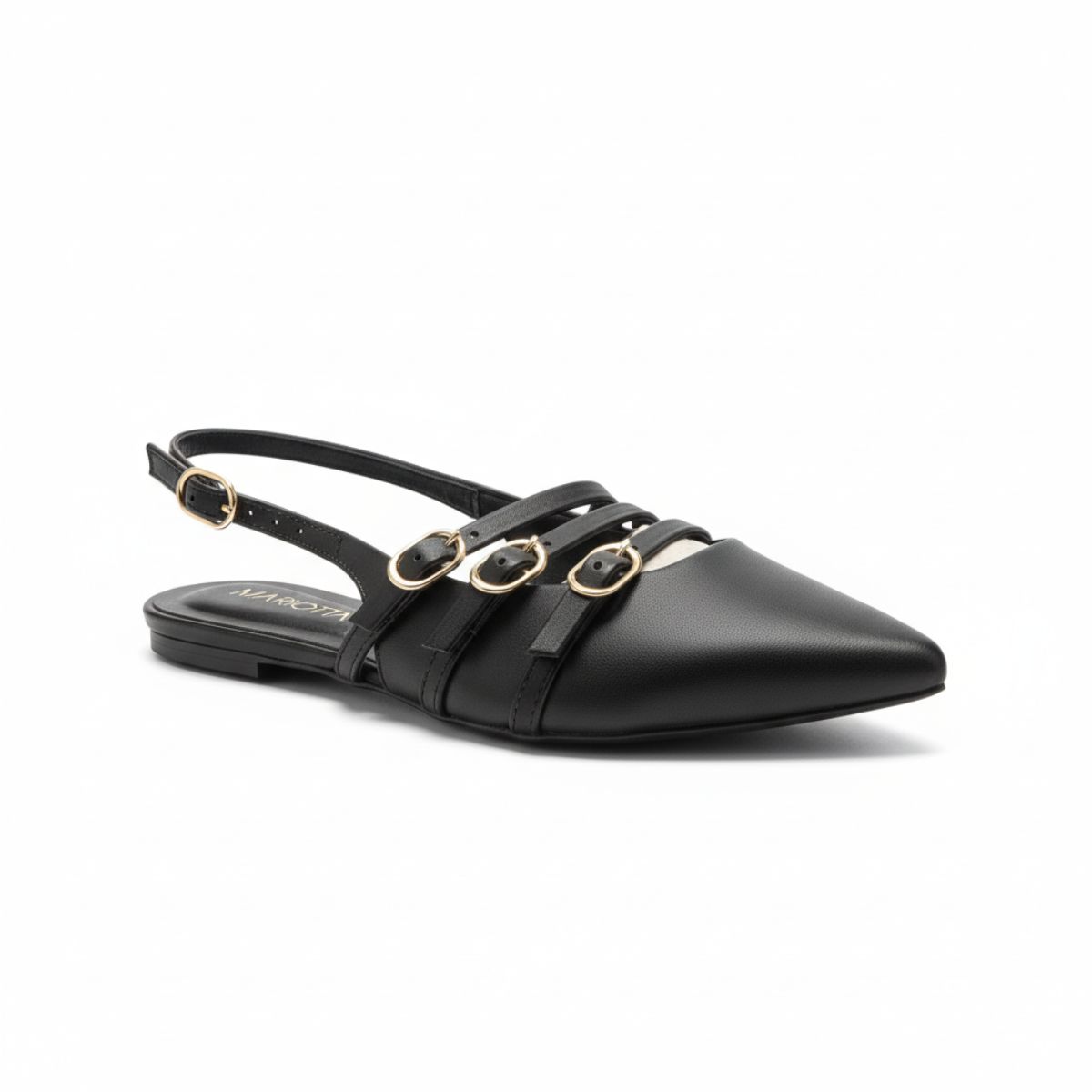 Sapatilha Slingback Bico Fino com Tiras e Fivelas Douradas