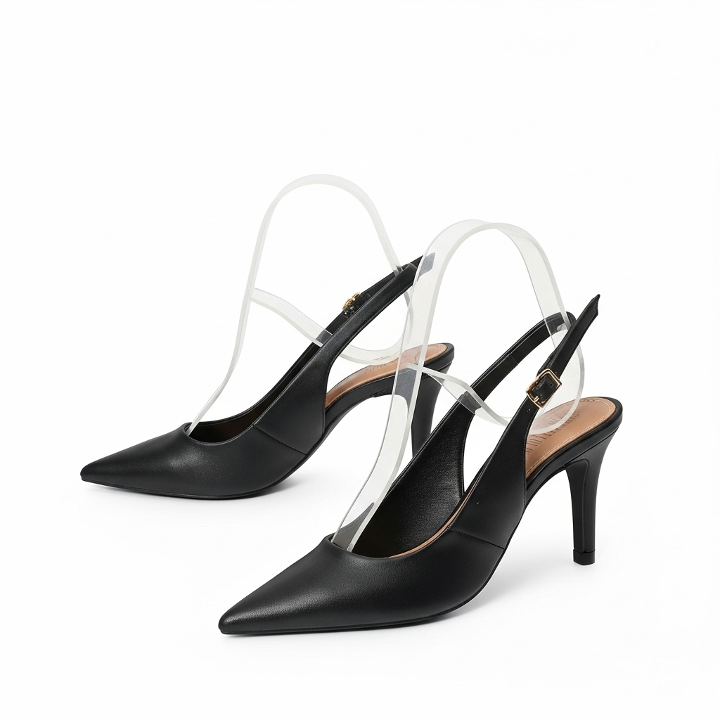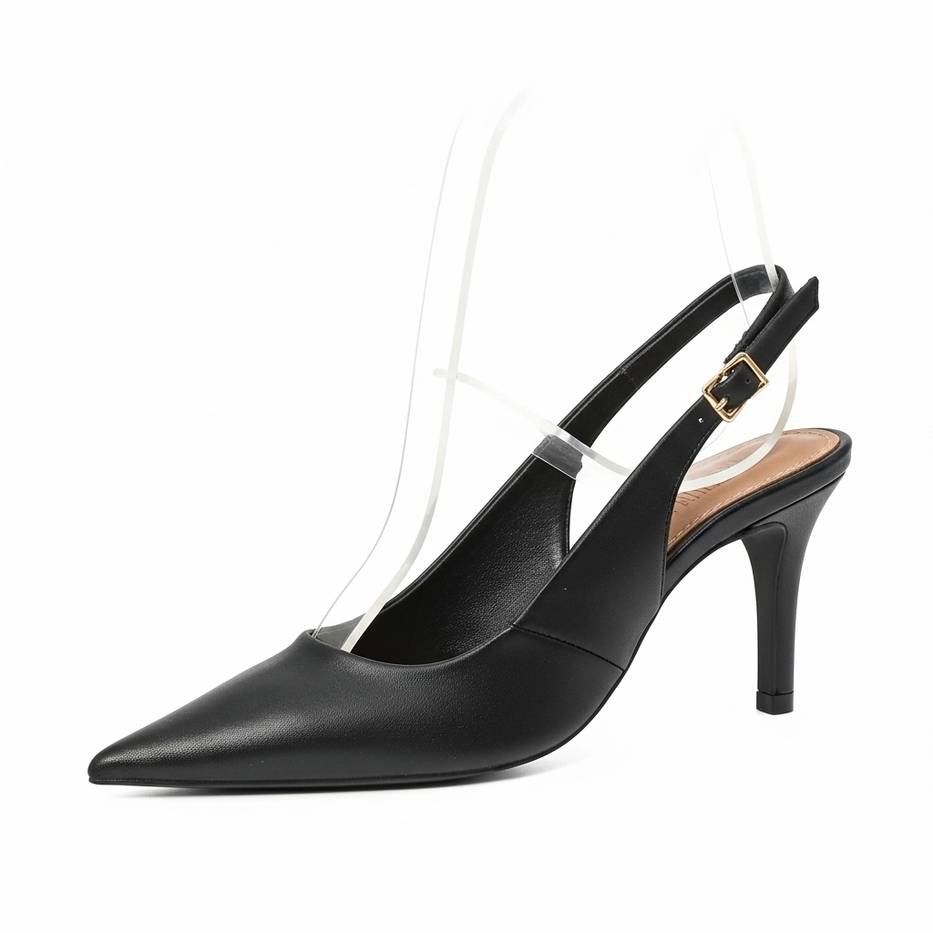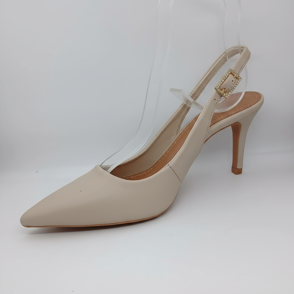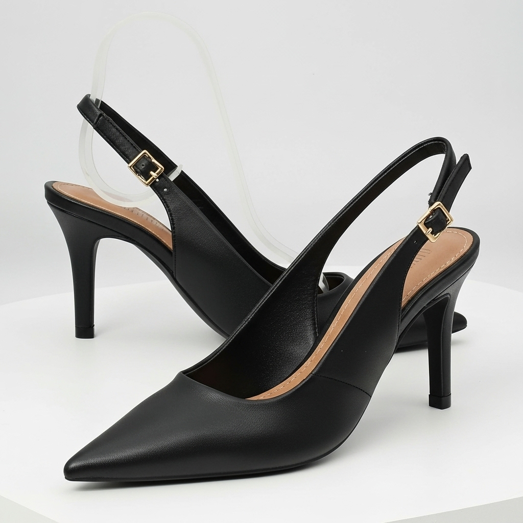 Seu design clássico de bico fino alonga a silhueta, enquanto o salto fino proporciona uma postura elegante e feminina. O detalhe slingback, com uma tira que contorna o calcanhar, não só adiciona um charme extra, mas também garante um ajuste seguro e confortável graças à sua fivela regulável.