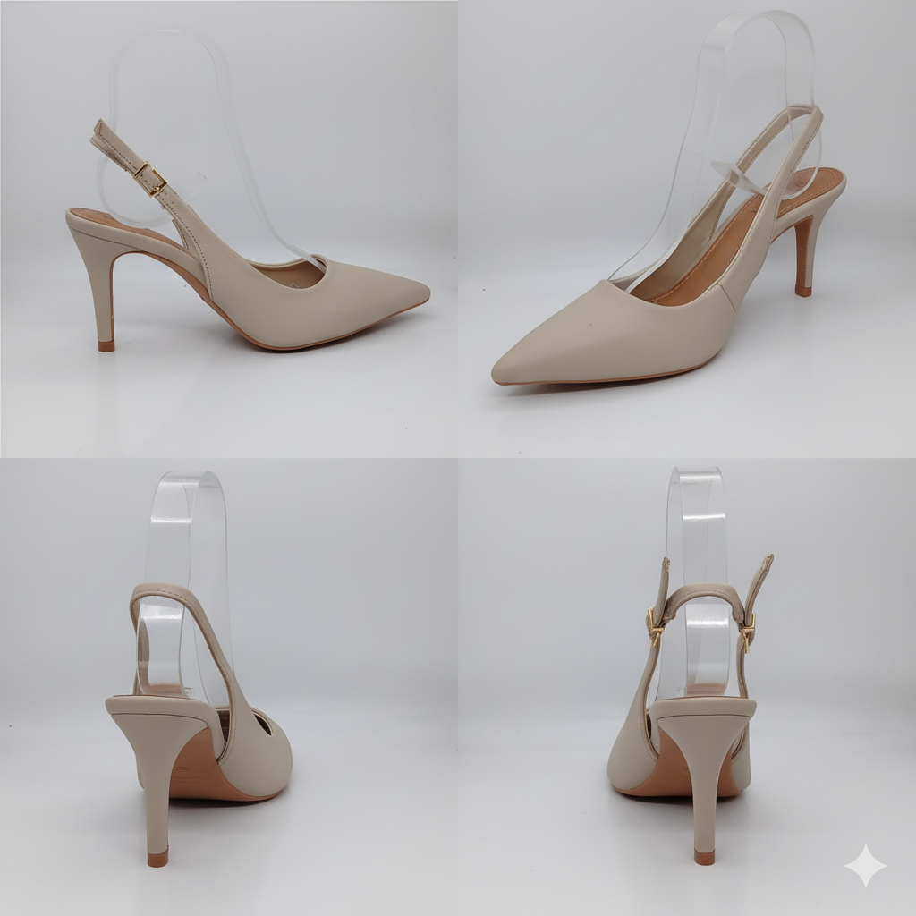 Modelo Slingback: Possui abertura no calcanhar com uma tira fina para um toque de delicadeza e segurança.